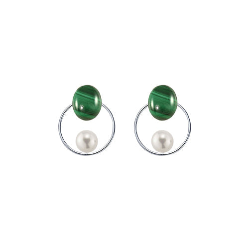 Malachite Round + Pearl + Circle Sterling Silver Earrings