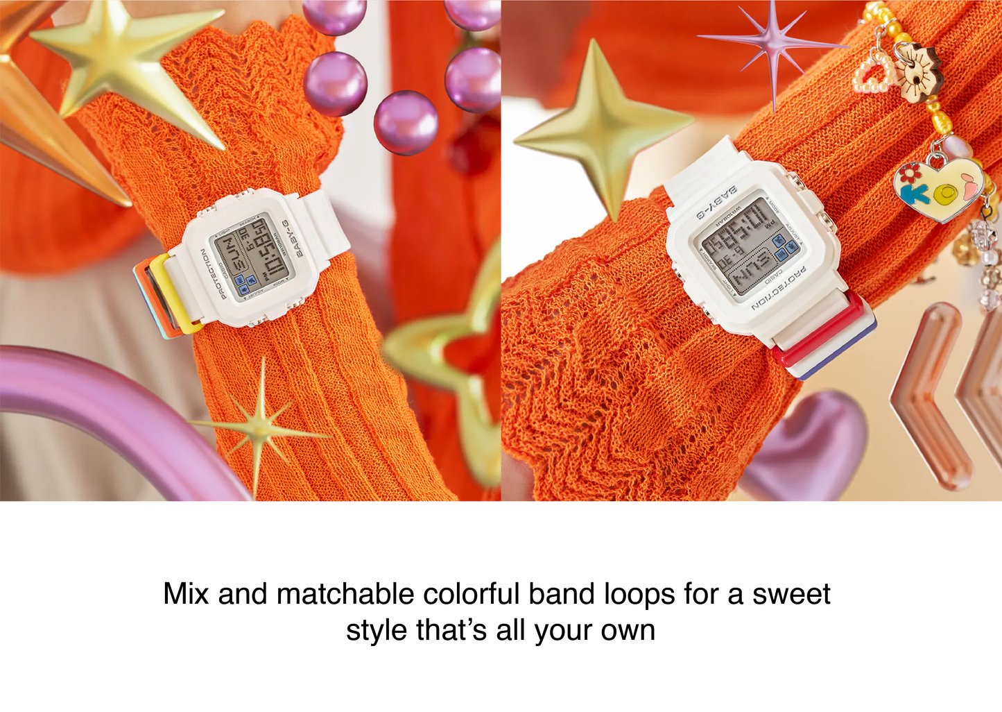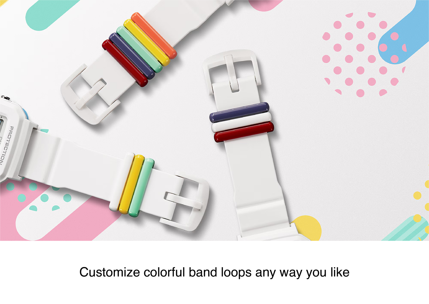 The BGD10L-7 features a clean white base with nine interchangeable band loops, including seven solid colors and two translucent hues, enabling endless styling possibilities. Additionally, pixel-art animations in Timekeeping Mode add a charming touch, featuring characters such as a surfer, dancer, dolphin, blowfish, dog, and cat.