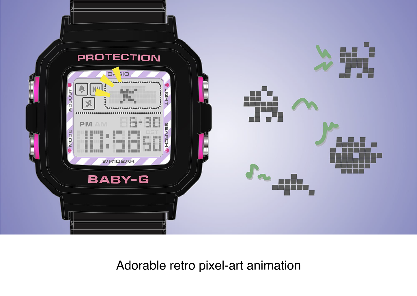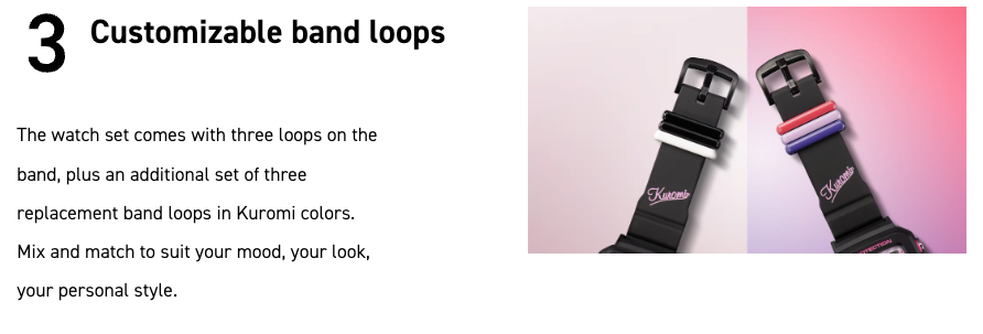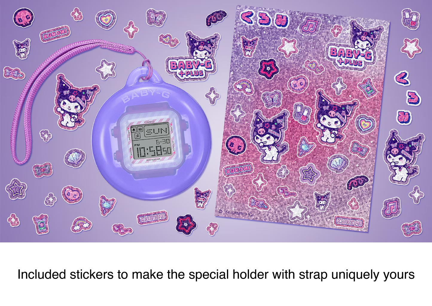 The BGD10KKM-1 is a stylish and playful Kuromi collaboration model, perfect for fans of Kuromi and BABY-G. With interchangeable styling loops, a removable case for charm use, and a Kuromi-themed design, this watch blends fashion, functionality, and fun. Its shock resistance and water resistance ensure durability, making it a perfect daily accessory or collectible piece.