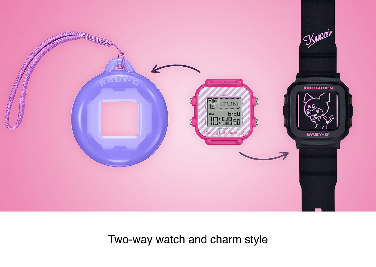 The BGD10KKM-1 is a special collaboration model between BABY-G and Kuromi, celebrating BABY-G’s 30th anniversary with a unique two-way wristwatch-and-charm design. Featuring playful Kuromi-themed accents, this watch blends functionality, durability, and individuality.