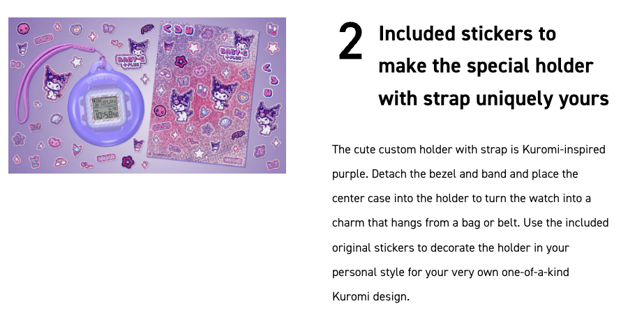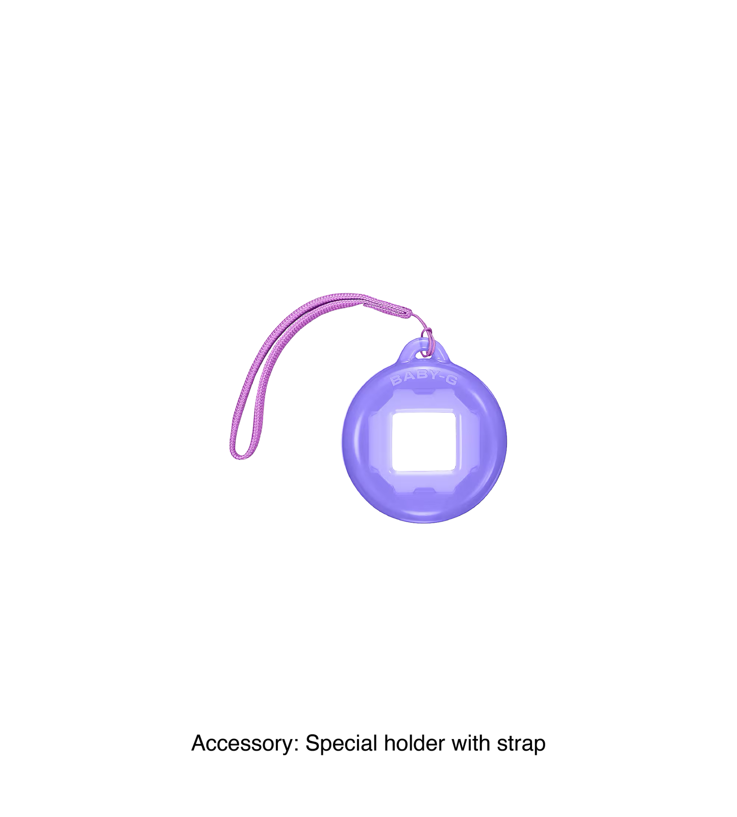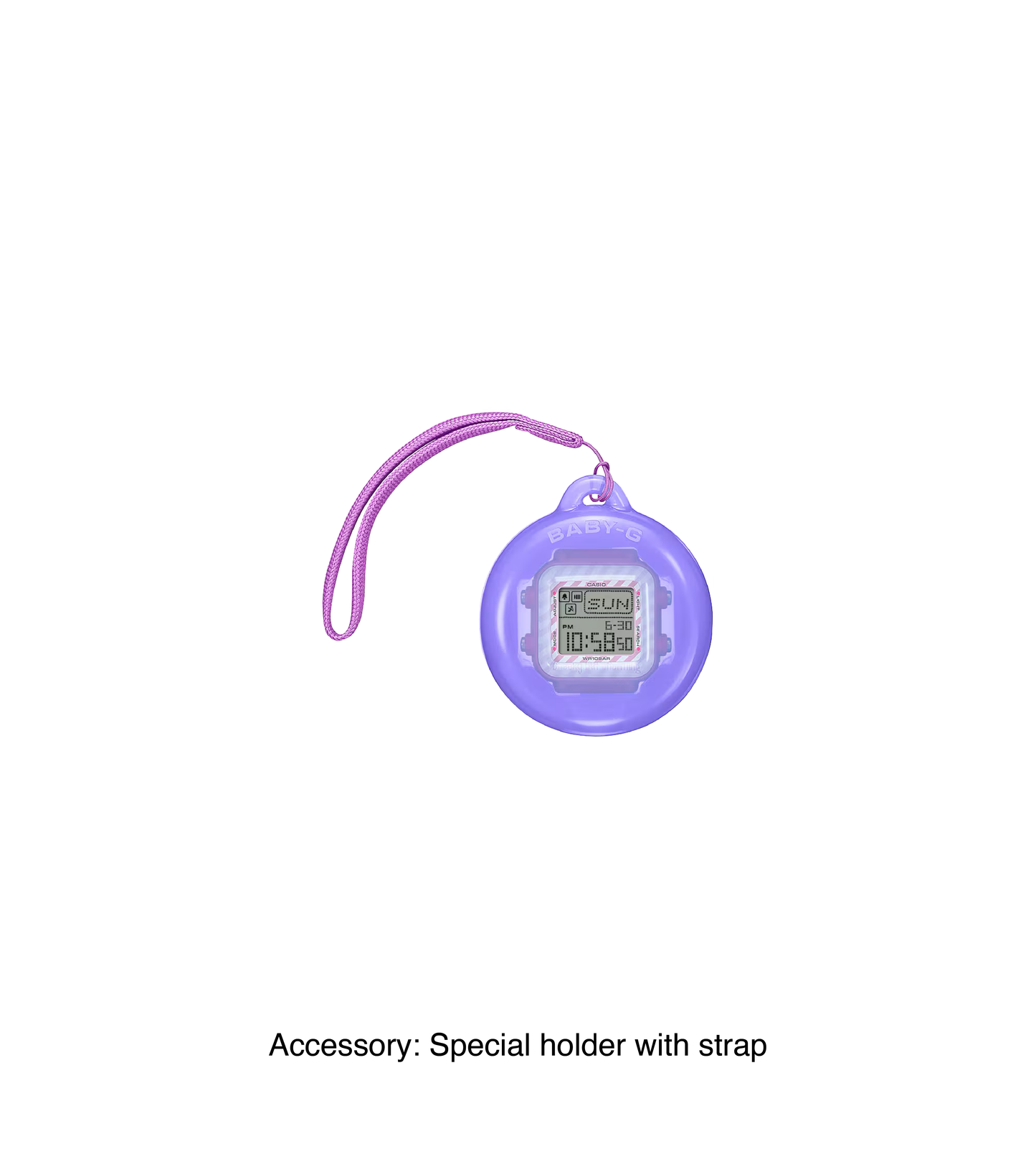 The BGD10KKM-1 features a black base with purple and pink accents, embodying Kuromi’s mischievous and cute personality. The LED backlight reveals an image of Kuromi, while the case back is engraved with a special Kuromi clock face marking BABY-G’s 30th anniversary. Additionally, the watch case can be removed and inserted into a special pendant-like holder, transforming it into a bag charm or accessory.