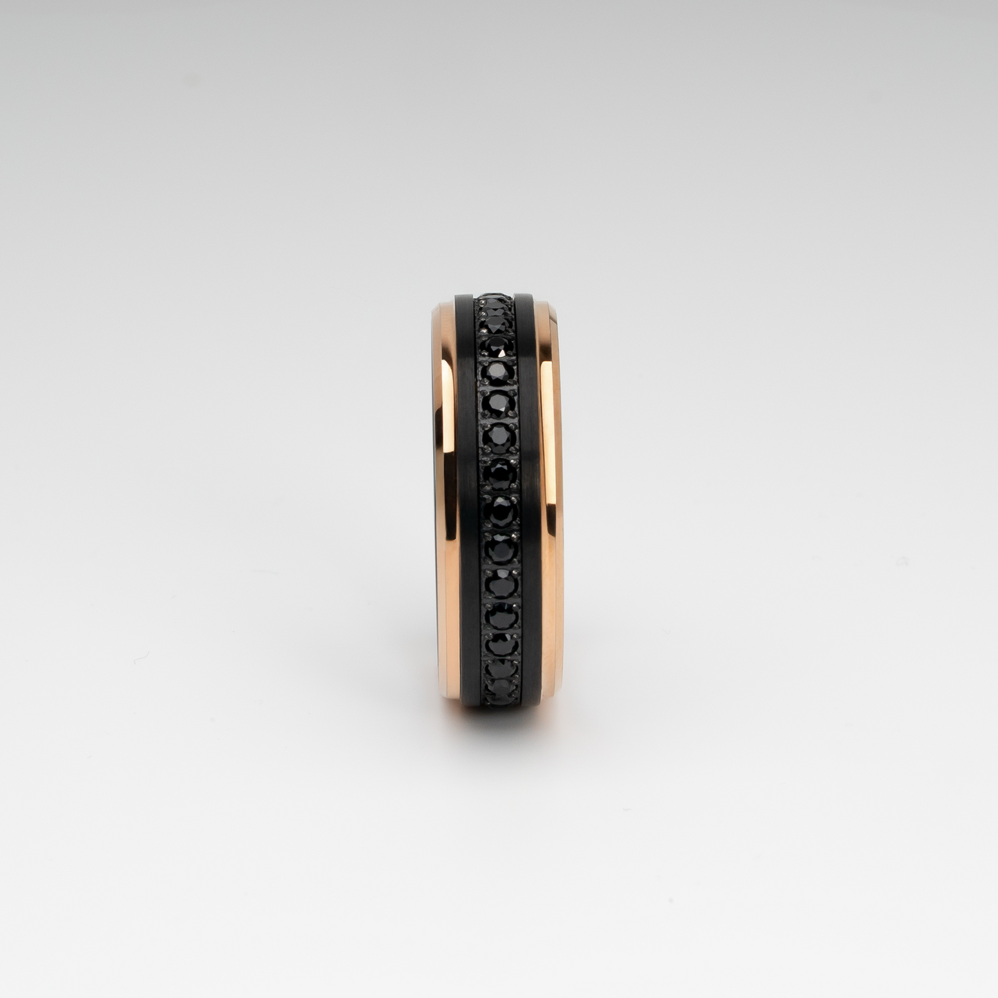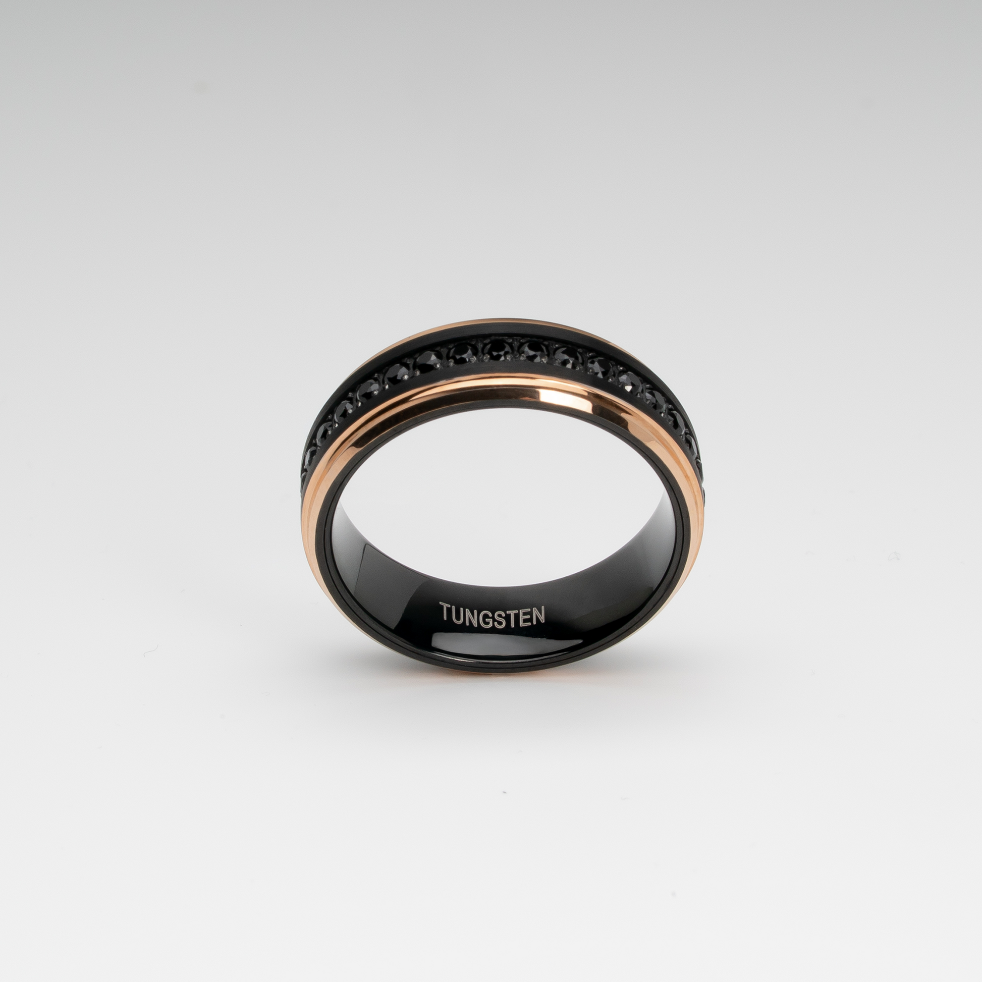 A perfect combination of strength, sophistication, and modern style, this black tungsten ring with black CZ stones and rose gold edges is a unique and timeless addition to any jewelry collection.