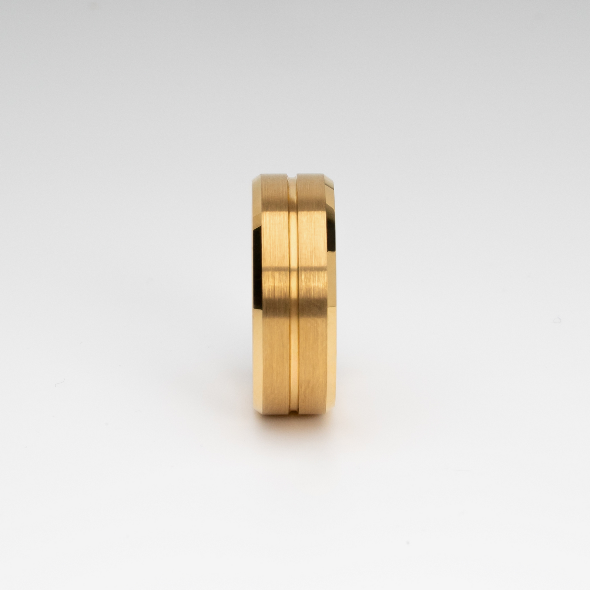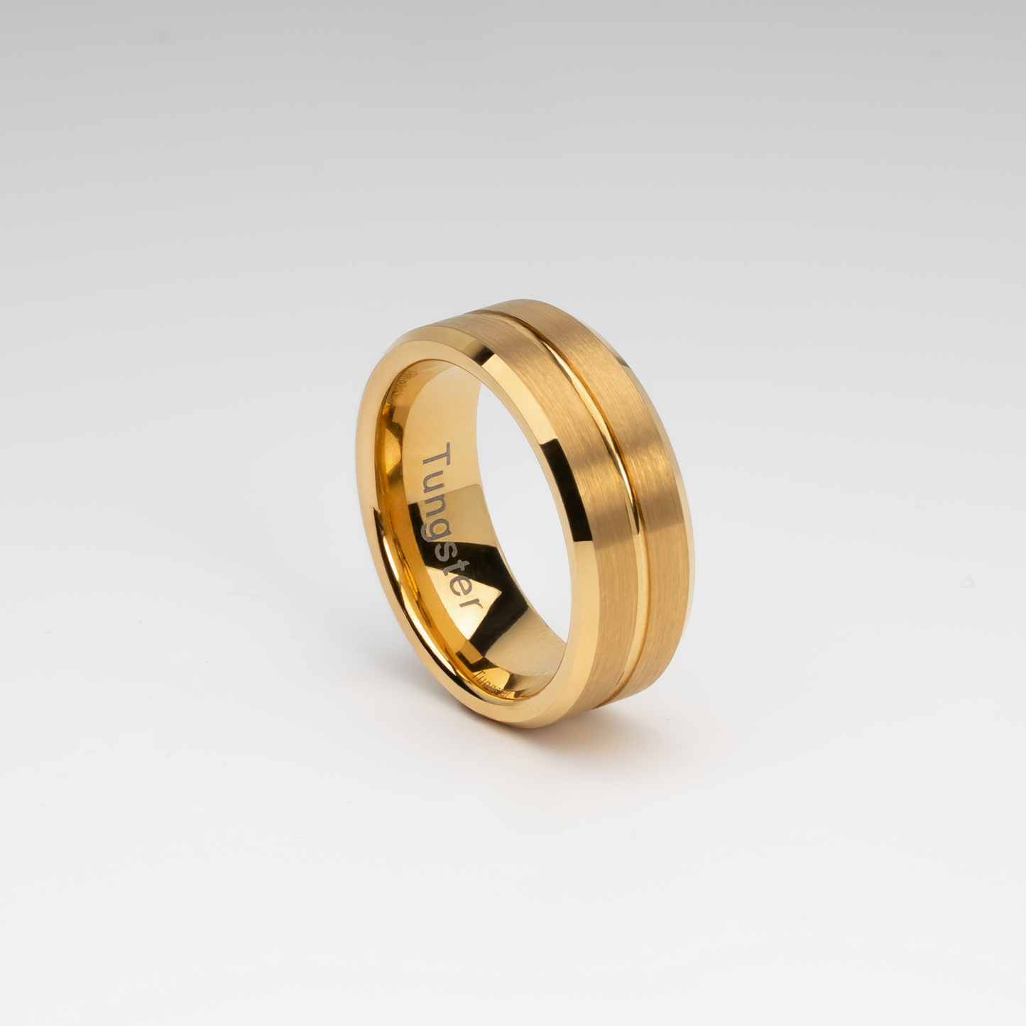 This gold tungsten carbide ring features a sophisticated brushed finish, enhanced by two sleek grooves that add a modern and refined touch. The subtle contrast between the brushed texture and polished edges creates a luxurious yet understated style, making this ring a perfect choice for weddings, engagements, or everyday wear.