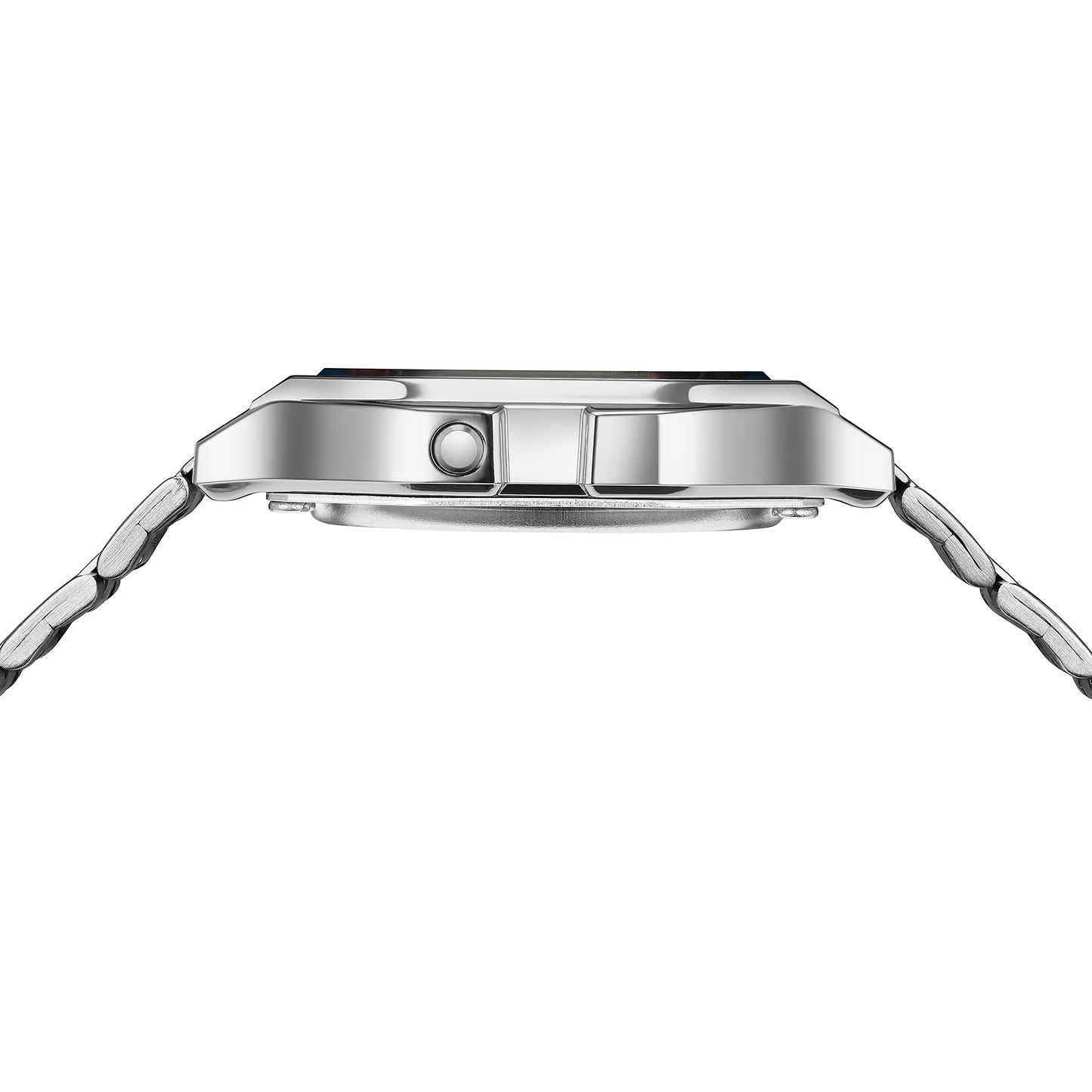 This watch pairs a chrome-plated resin case with a stainless steel band, delivering a retro aesthetic that fits seamlessly into modern street style. Its lightweight build at just 46 g makes it comfortable for all-day wear, while the adjustable clasp ensures a secure fit.