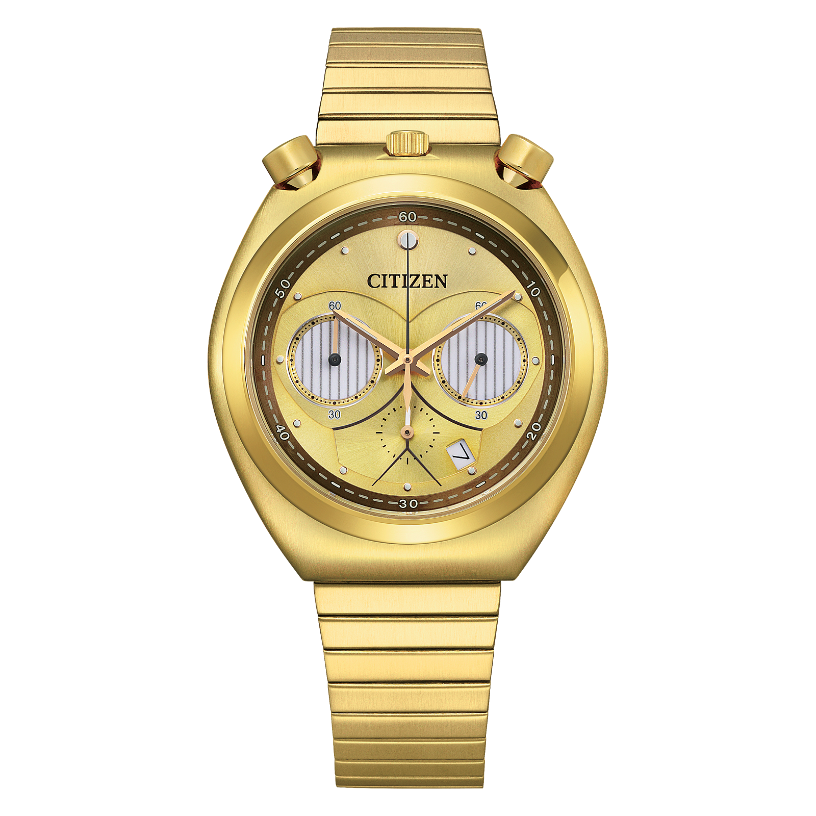 The CITIZEN STAR WARS C-3PO AN3662-51W is a beautifully crafted tribute to one of the most beloved droids in the Star Wars saga. Part of the Tsuno Chrono series, inspired by Citizen’s 1972 model, this watch features tsuno "horns" at the 12 o’clock position, reminiscent of its vintage roots. Whether you’re a longtime Star Wars collector or a watch enthusiast, this piece delivers a perfect balance of nostalgia, craftsmanship, and futuristic inspiration.