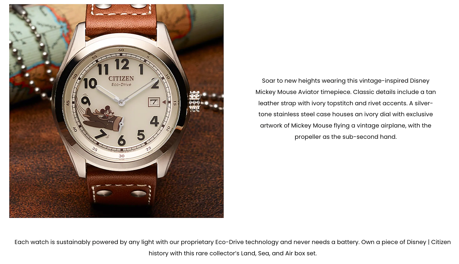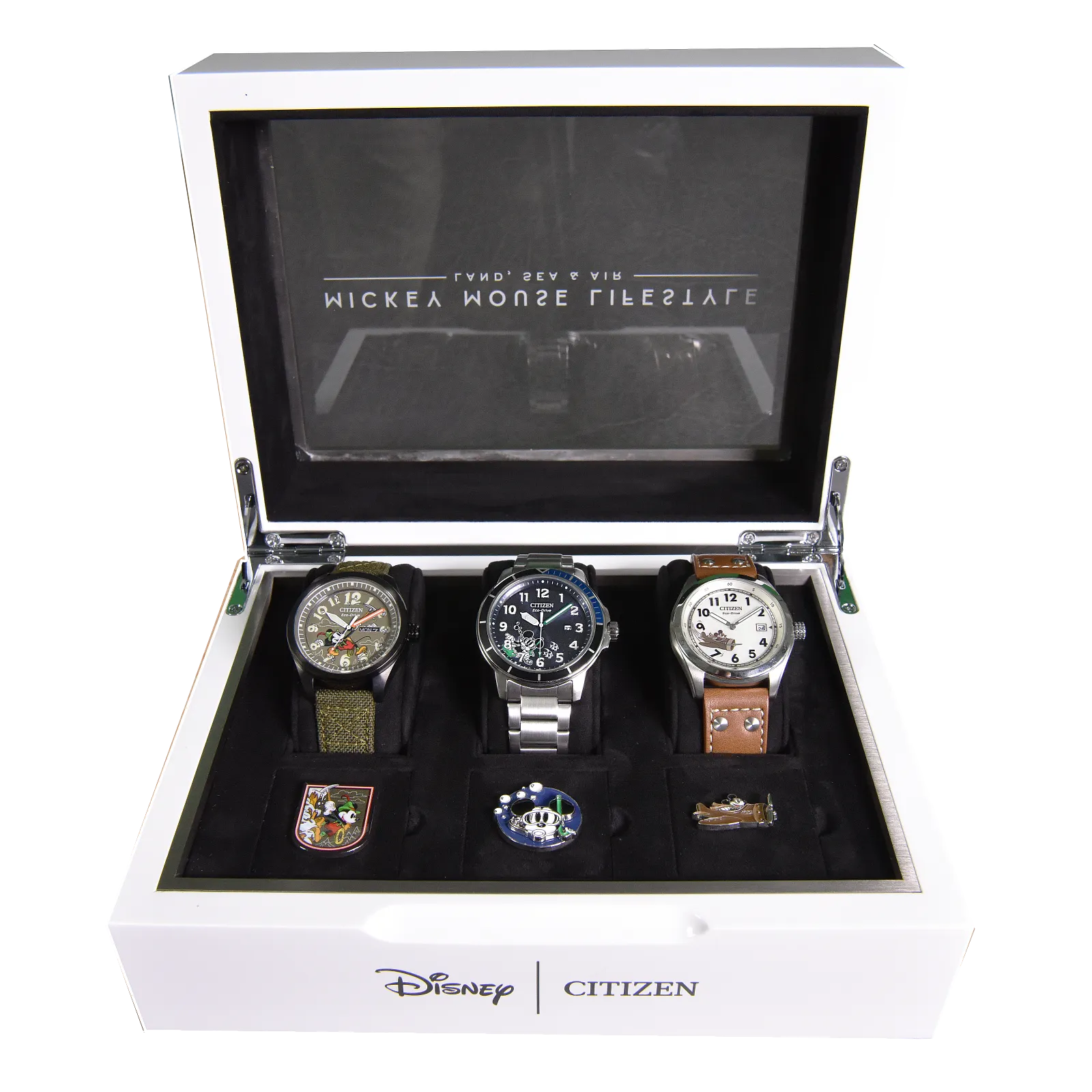 The CITIZEN DISNEY HVC-LIFESTYLE – Mickey Mouse World Adventure is a one-of-a-kind tribute to Disney’s beloved character. Combining Citizen’s Eco-Drive innovation with timeless Mickey Mouse storytelling, this collector’s set represents the essence of adventure on land, sea, and air.