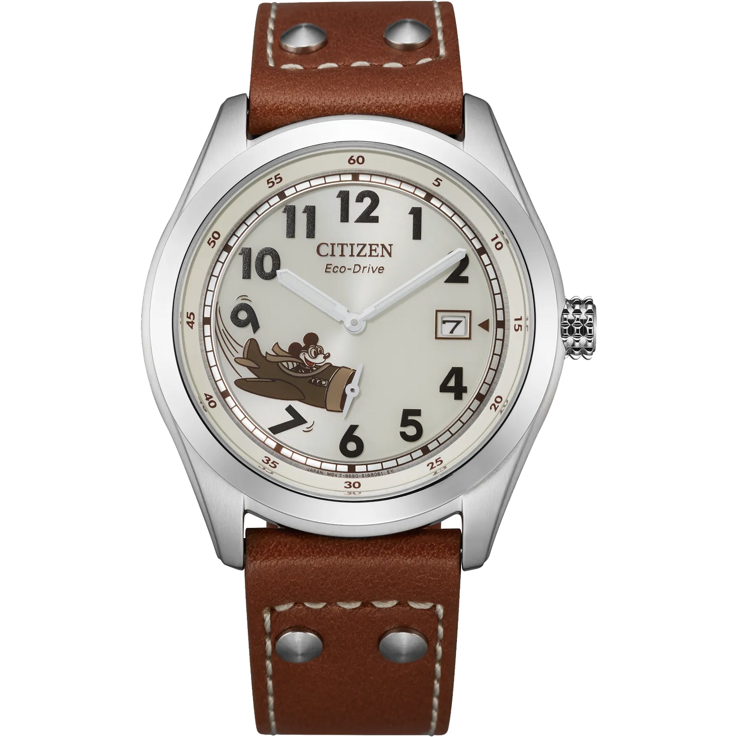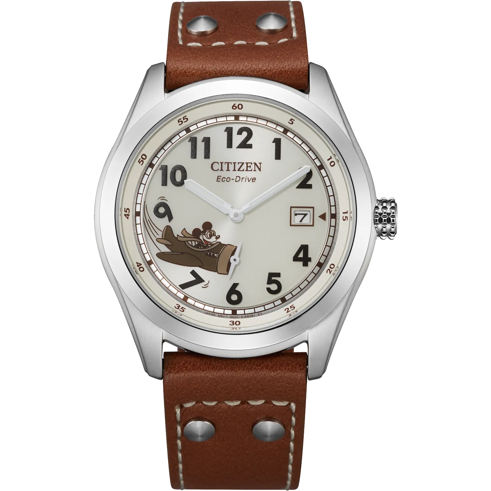 - Dial: Ivory, featuring Mickey Mouse piloting a vintage airplane, with the propeller as the sub-second hand.