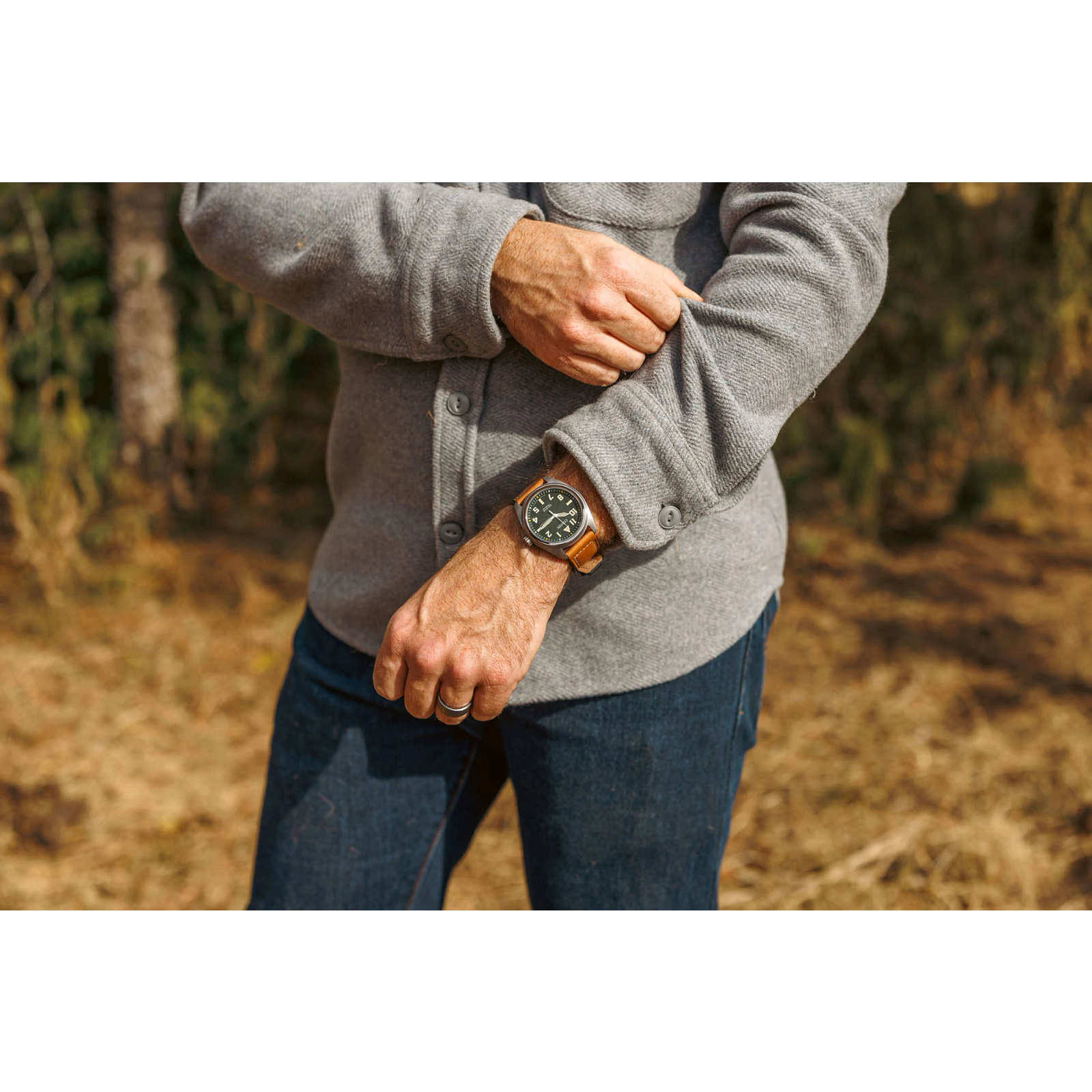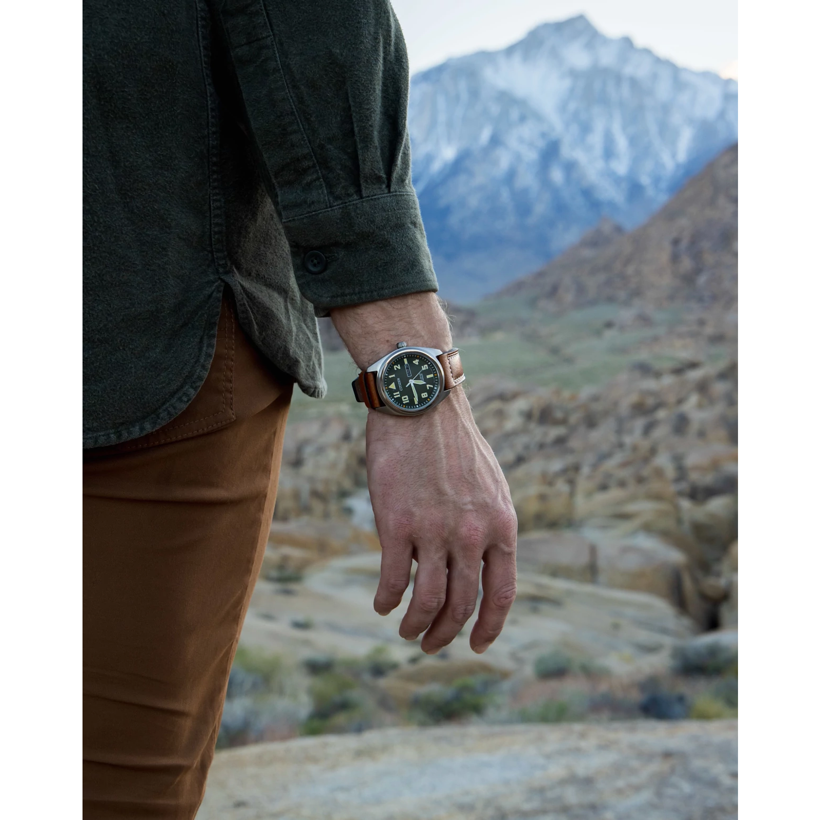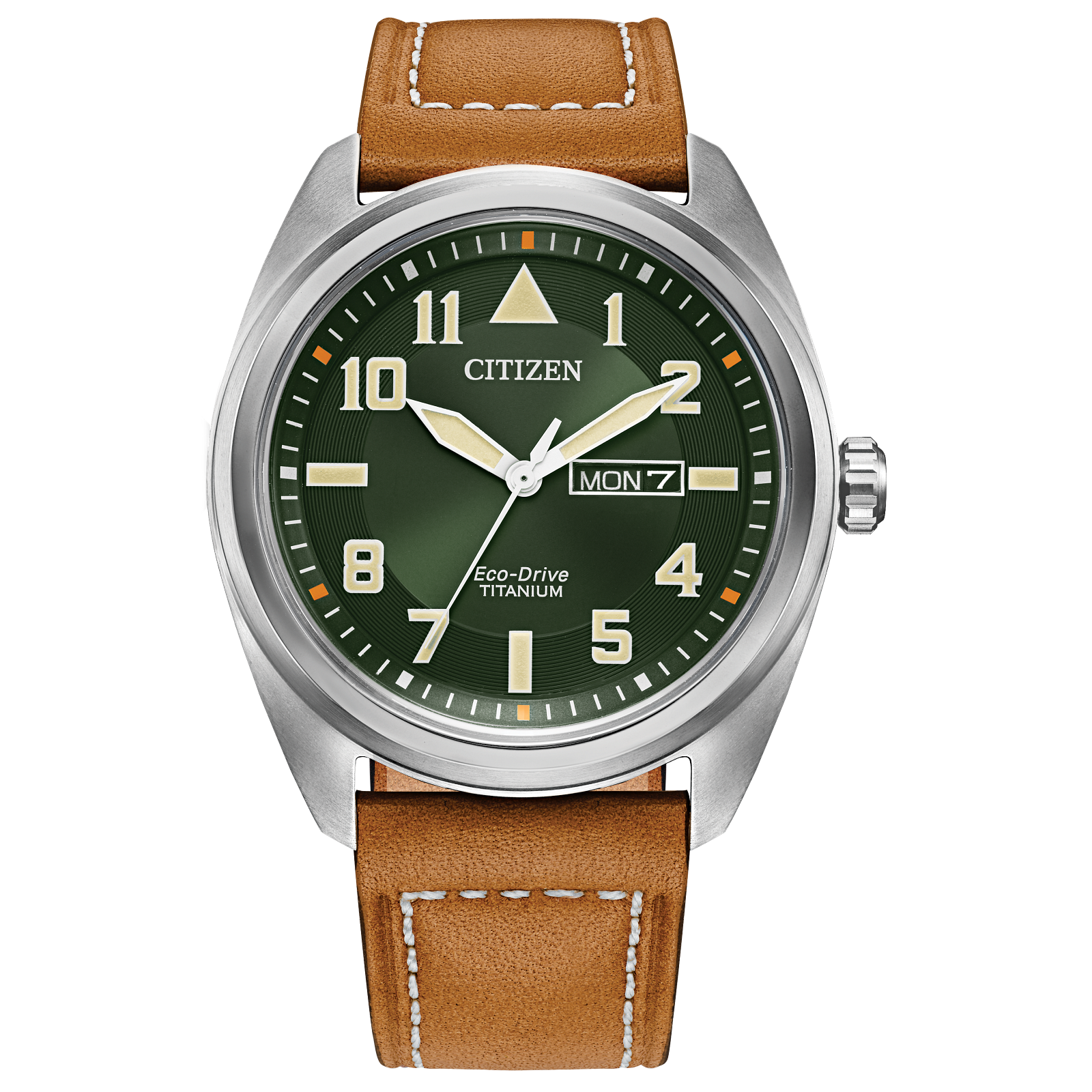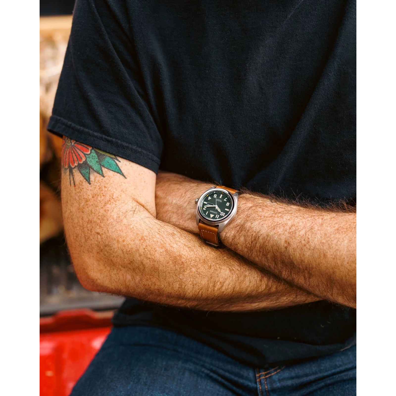 The Garrison BM8560-02X embodies classic elegance with a touch of modern innovation. The Super Titanium™ case ensures excellent durability while remaining lightweight, making it comfortable for everyday wear. The green dial, contrasted with luminous hands and markers, ensures excellent readability in various lighting conditions. Paired with a rich caramel brown leather strap, this watch delivers a vintage charm suitable for both casual and formal occasions. Powered by Citizen’s Eco-Drive technology, it runs indefinitely on any light source, eliminating the need for battery replacements. With 100m water resistance and a sapphire crystal, the Garrison is designed for those who appreciate style, reliability, and lasting performance.