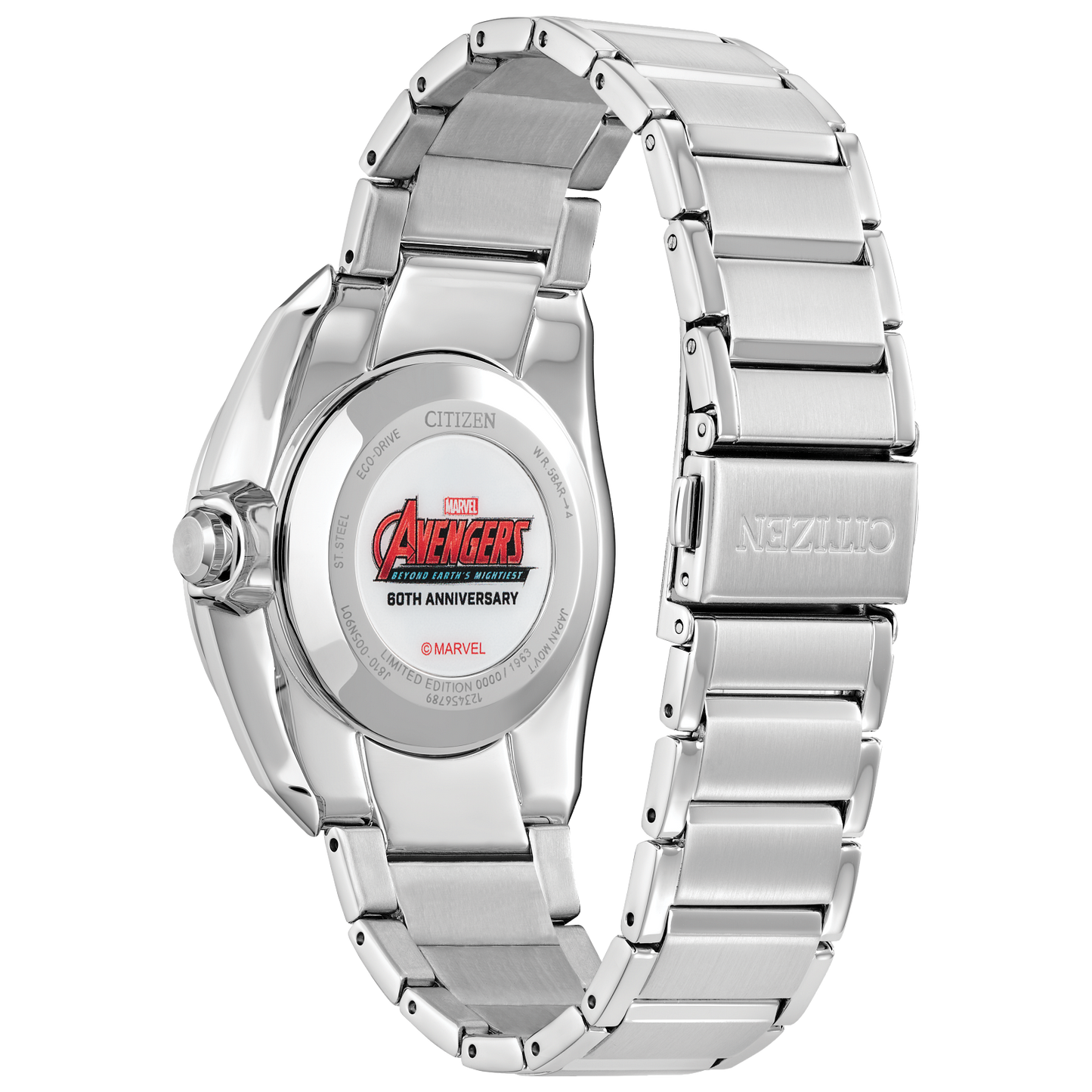 - Case: Silver-tone stainless steel with a commemorative case back engraved with "Marvel Avengers: Beyond Earth's Mightiest."