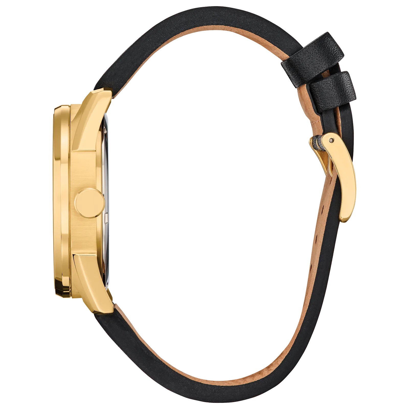 Strap & Case: Crafted with a smooth gold-tone stainless steel case and a comfortable black leather strap secured by a classic buckle clasp.