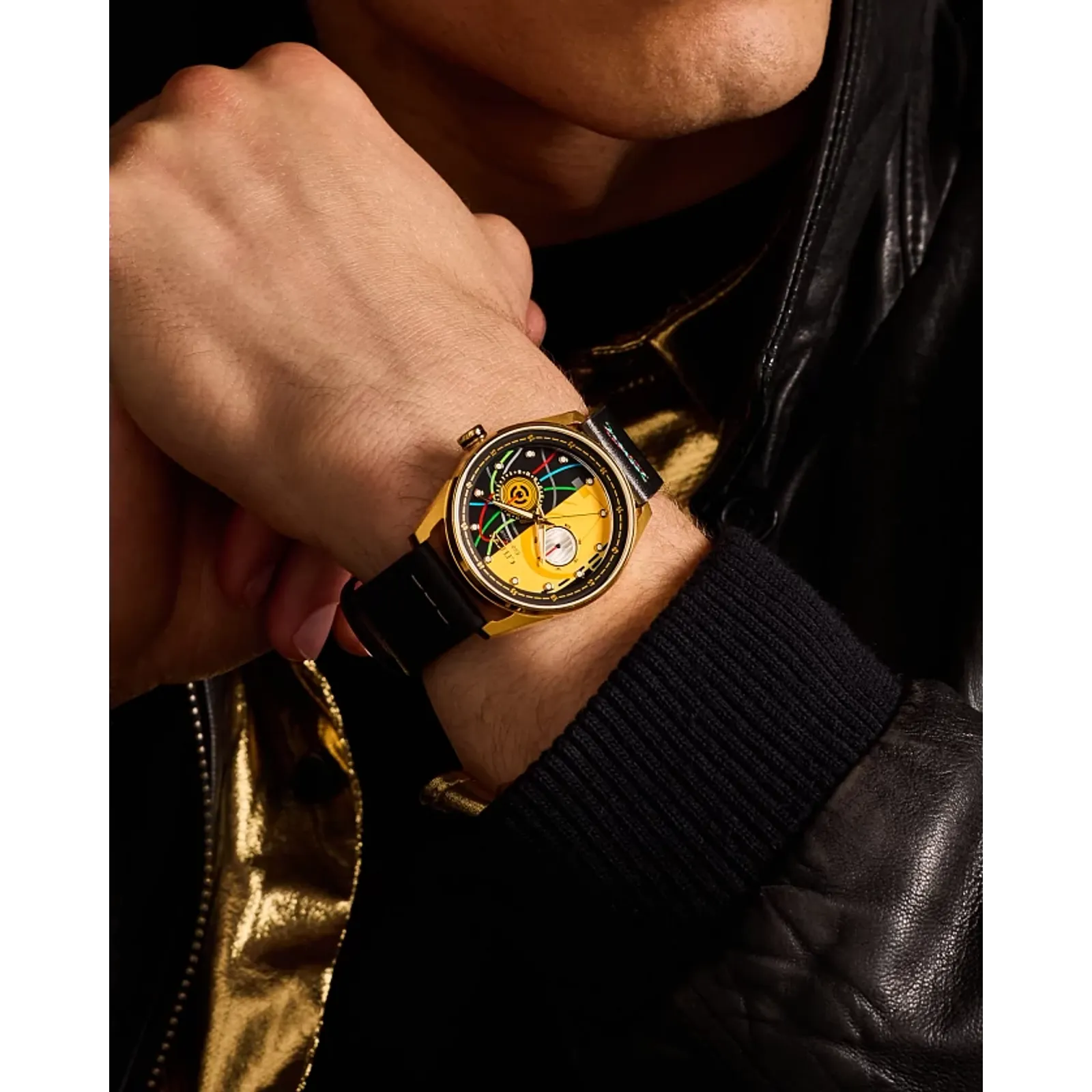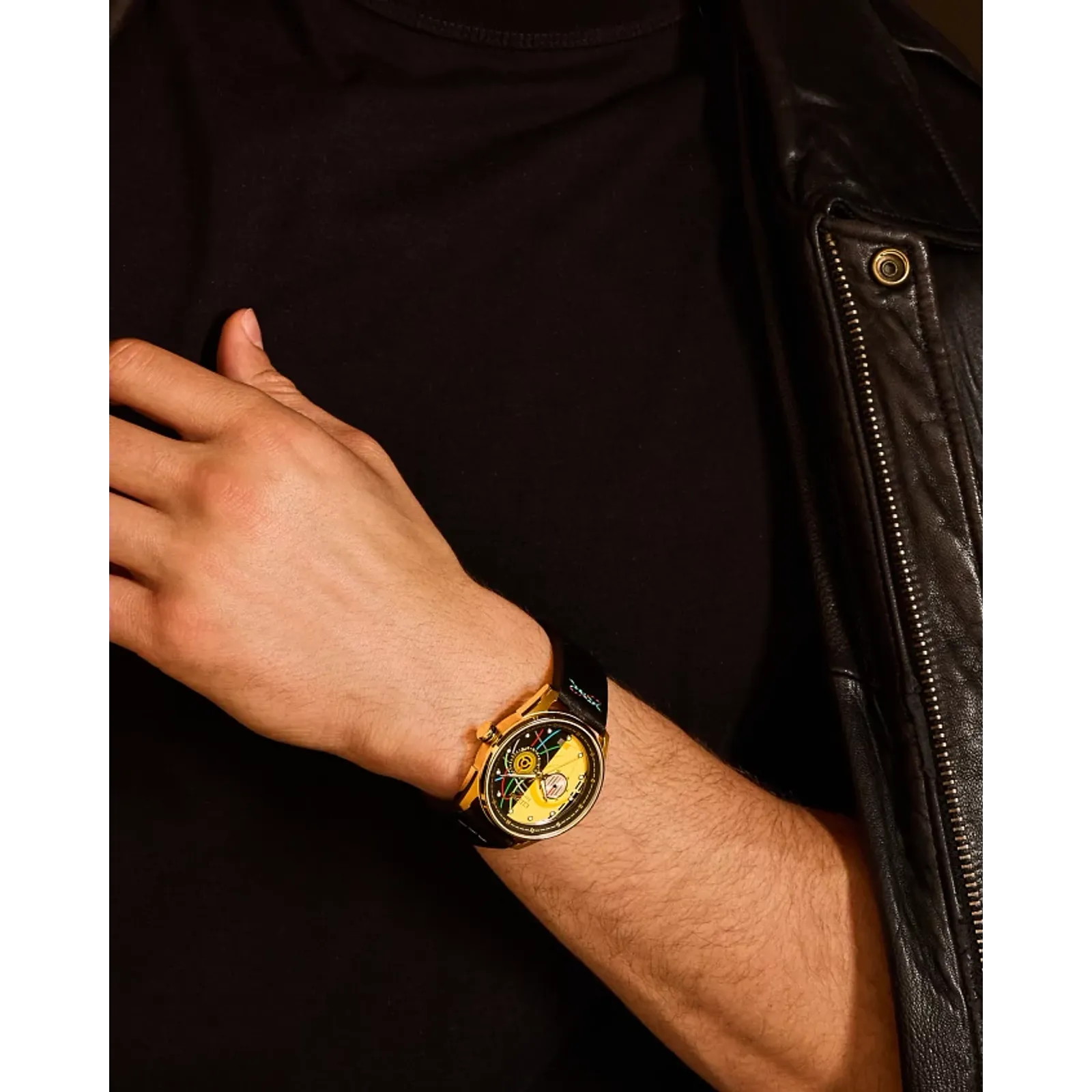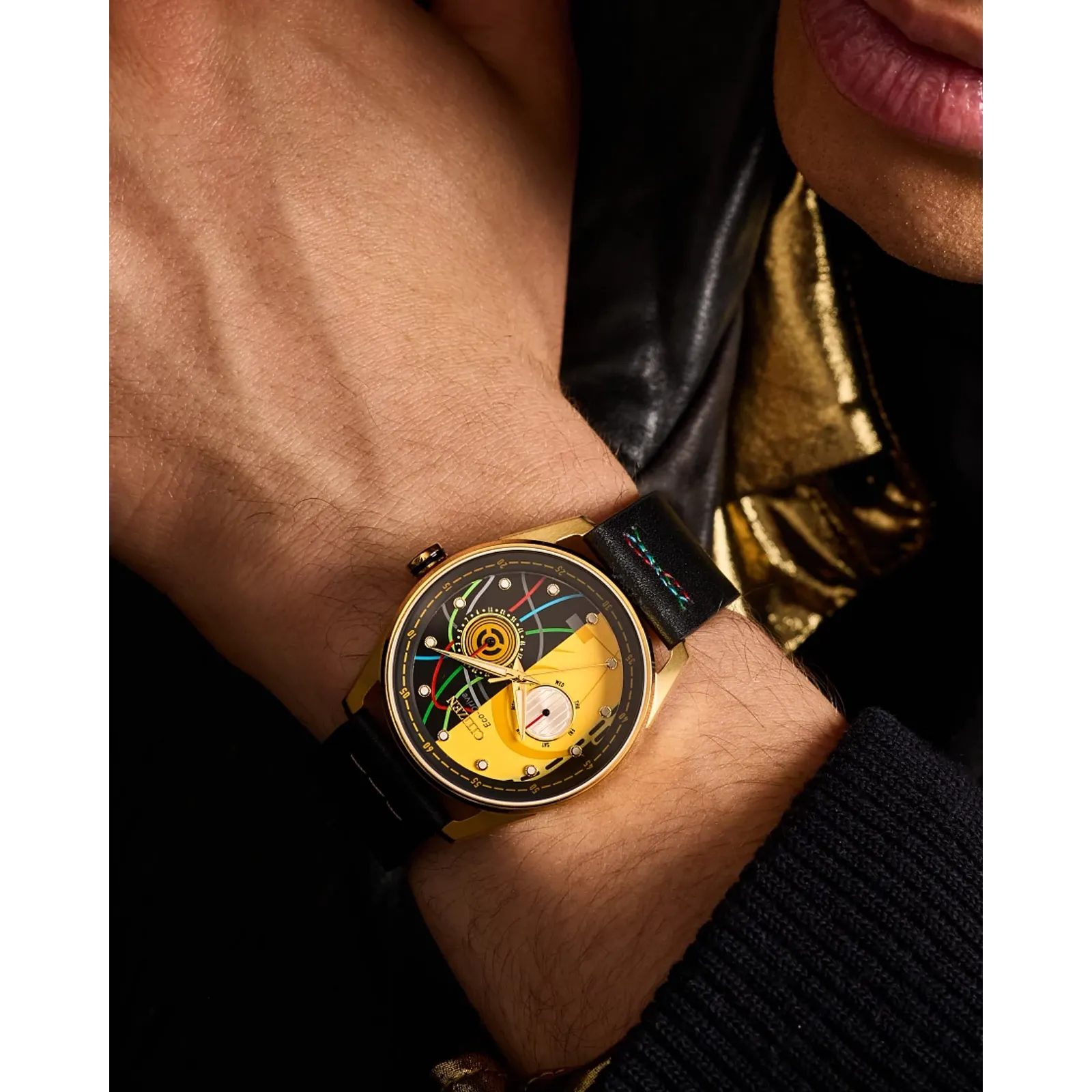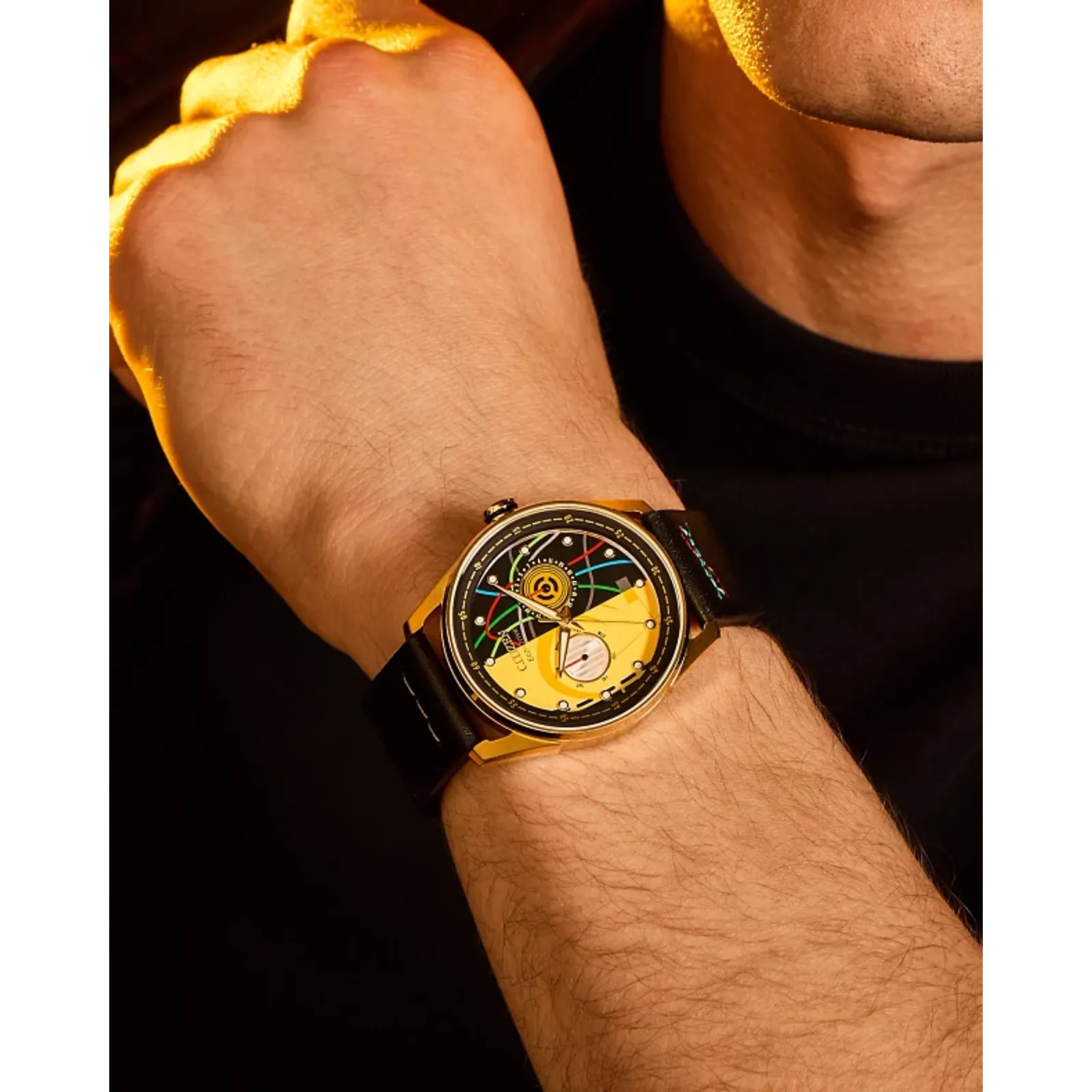 Graphics & Details: The yellow dial is accented with black, featuring luminous hands and markers for day-to-night visibility. The black leather strap is finished with colorful stitching inspired by the droid’s inner circuits, and C-3PO’s engraved likeness graces the case back.