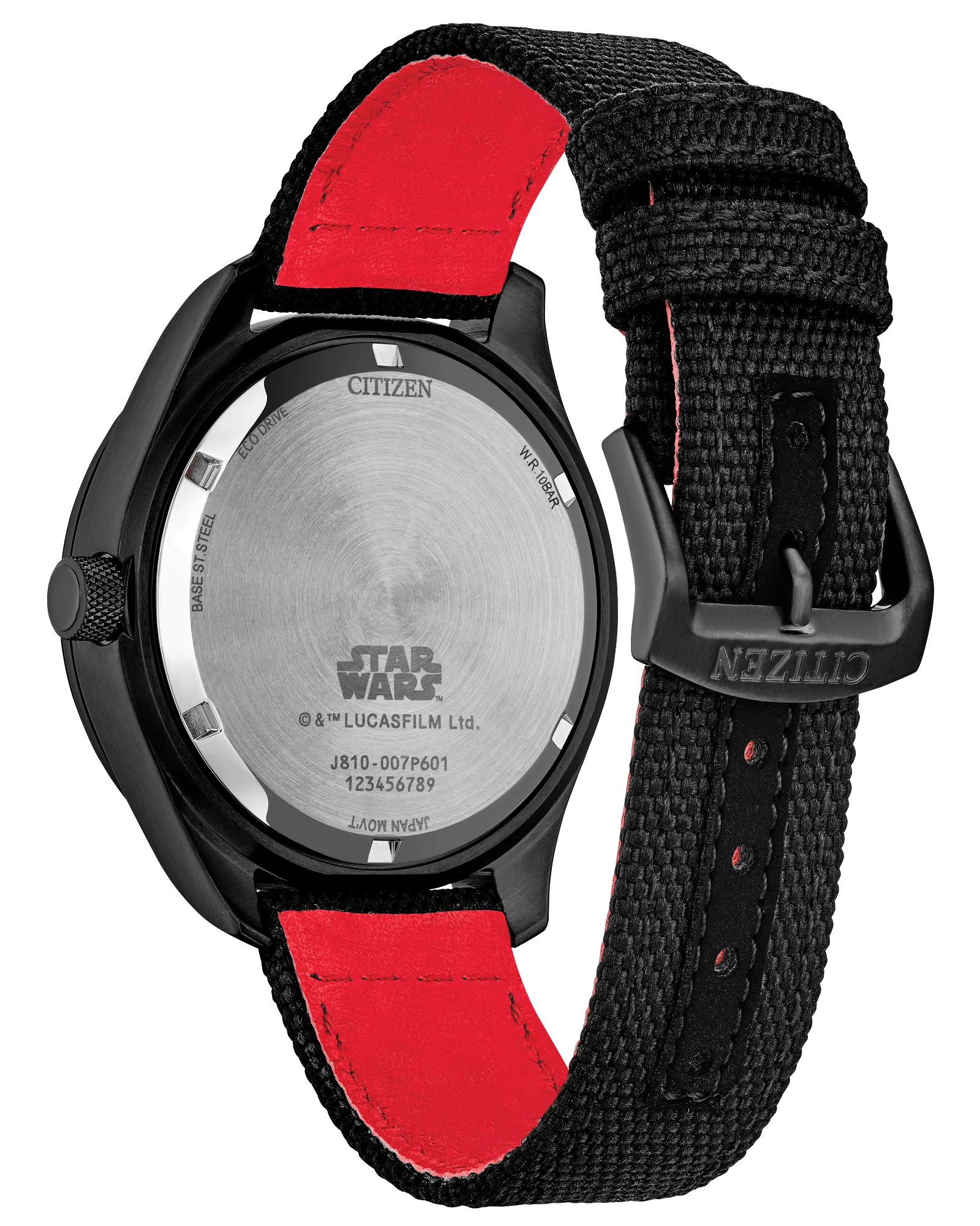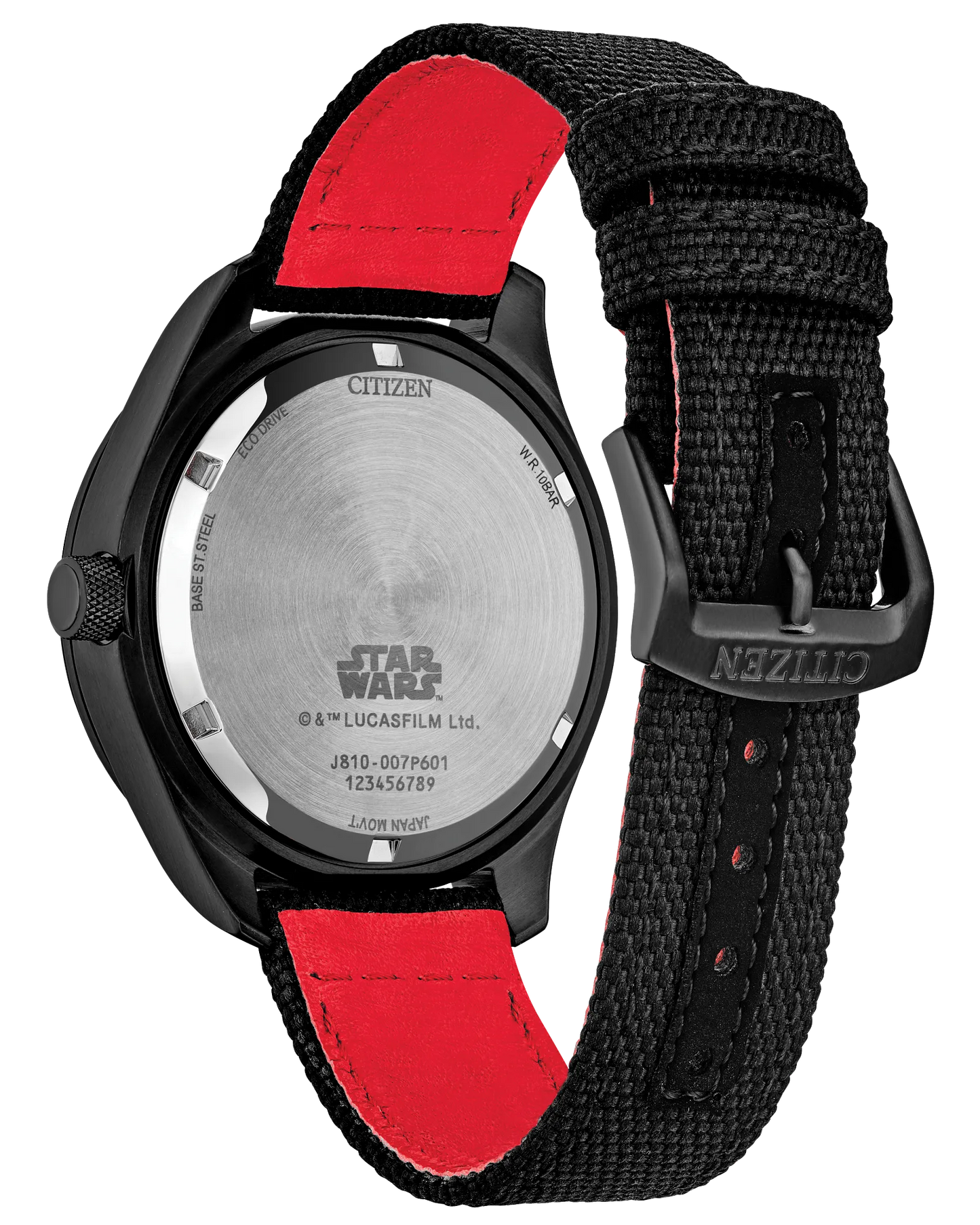 The 42.3mm black IP stainless steel case delivers a sleek yet sinister appearance, while the black woven Cordura® strap with red stitching adds durability and style — a perfect balance of rugged design and Sith precision.
