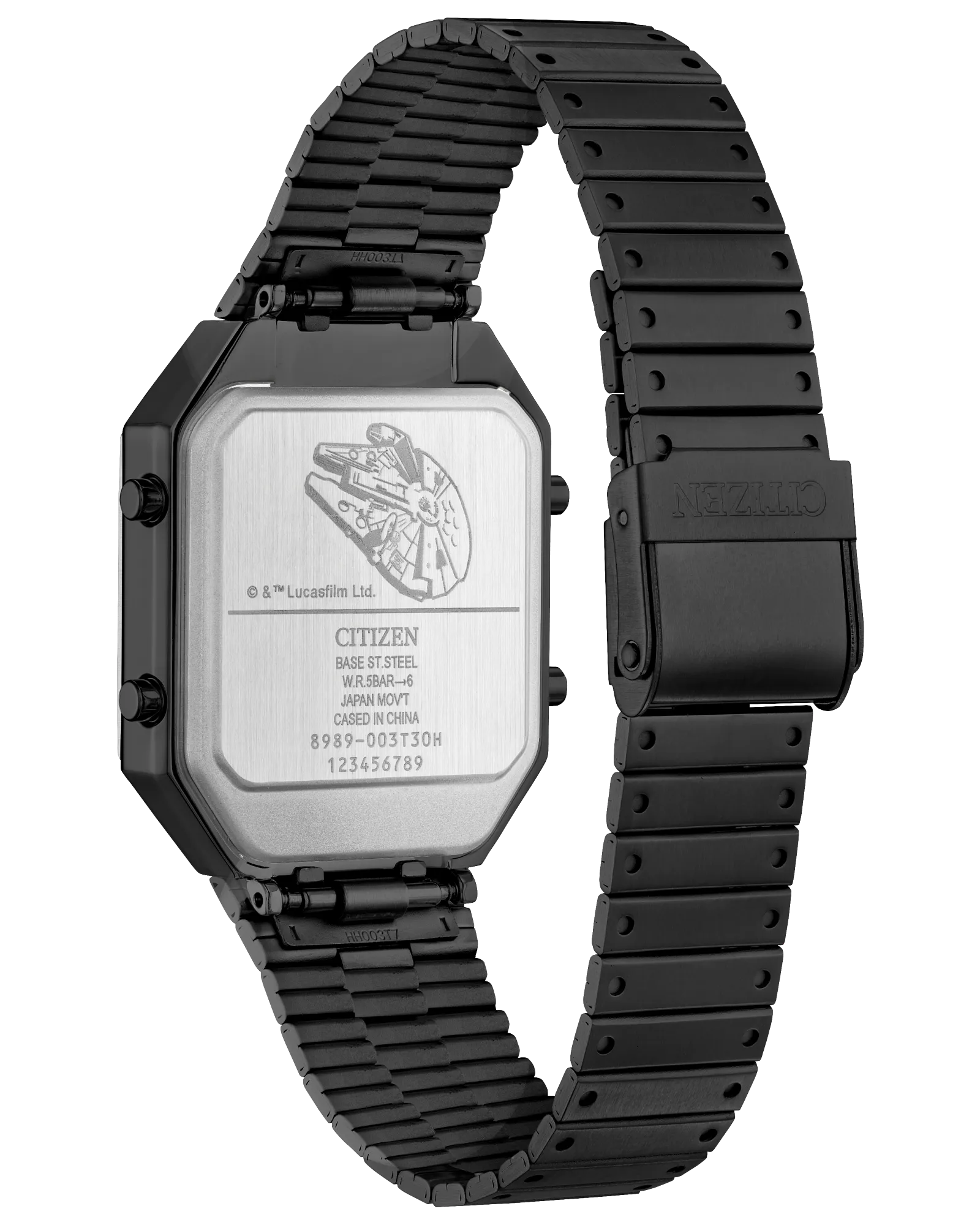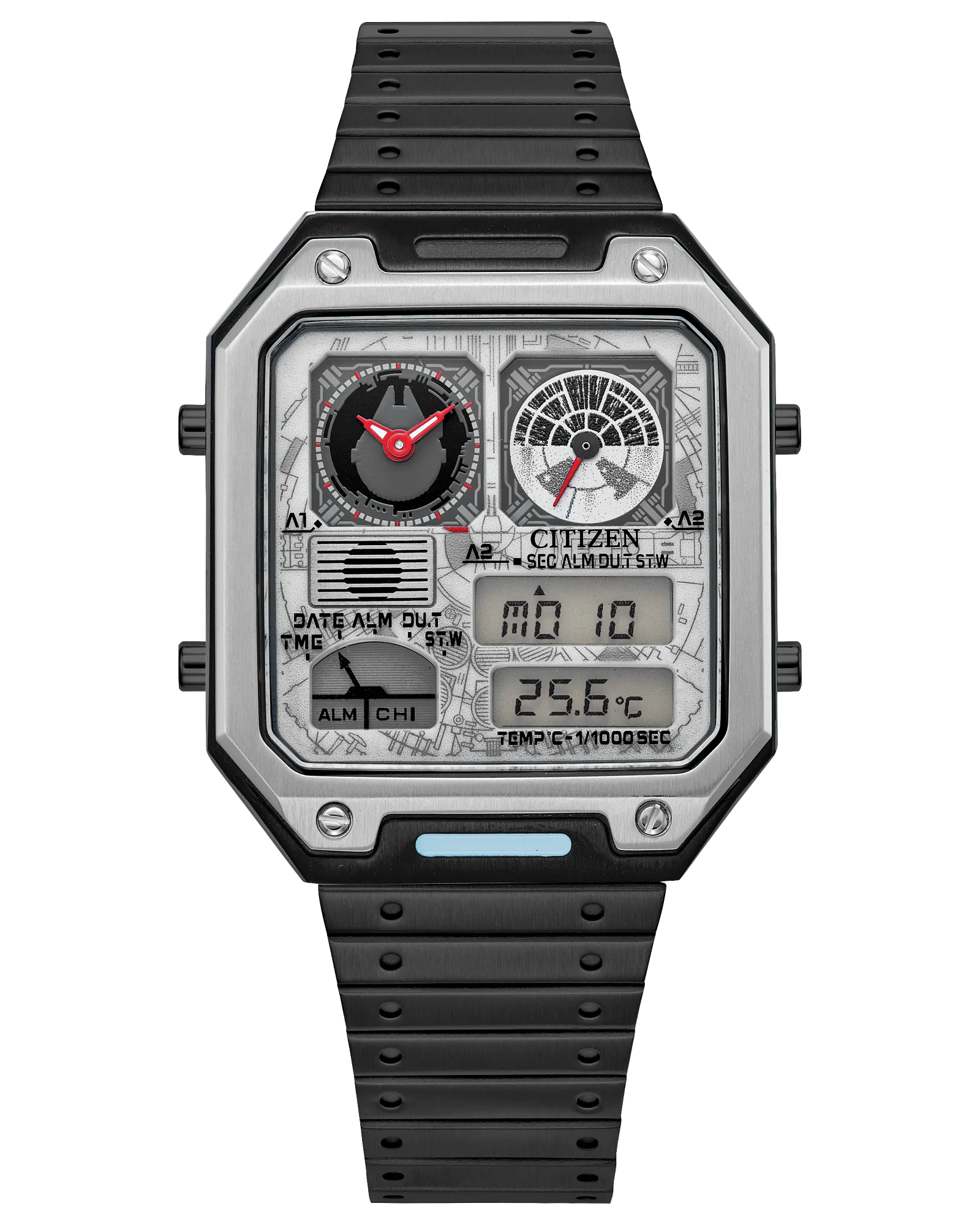 Inspired by Citizen’s classic analog-digital models from the 1980s, this reimagined edition captures the Millennium Falcon’s sleek, mechanical spirit with a modern edge.