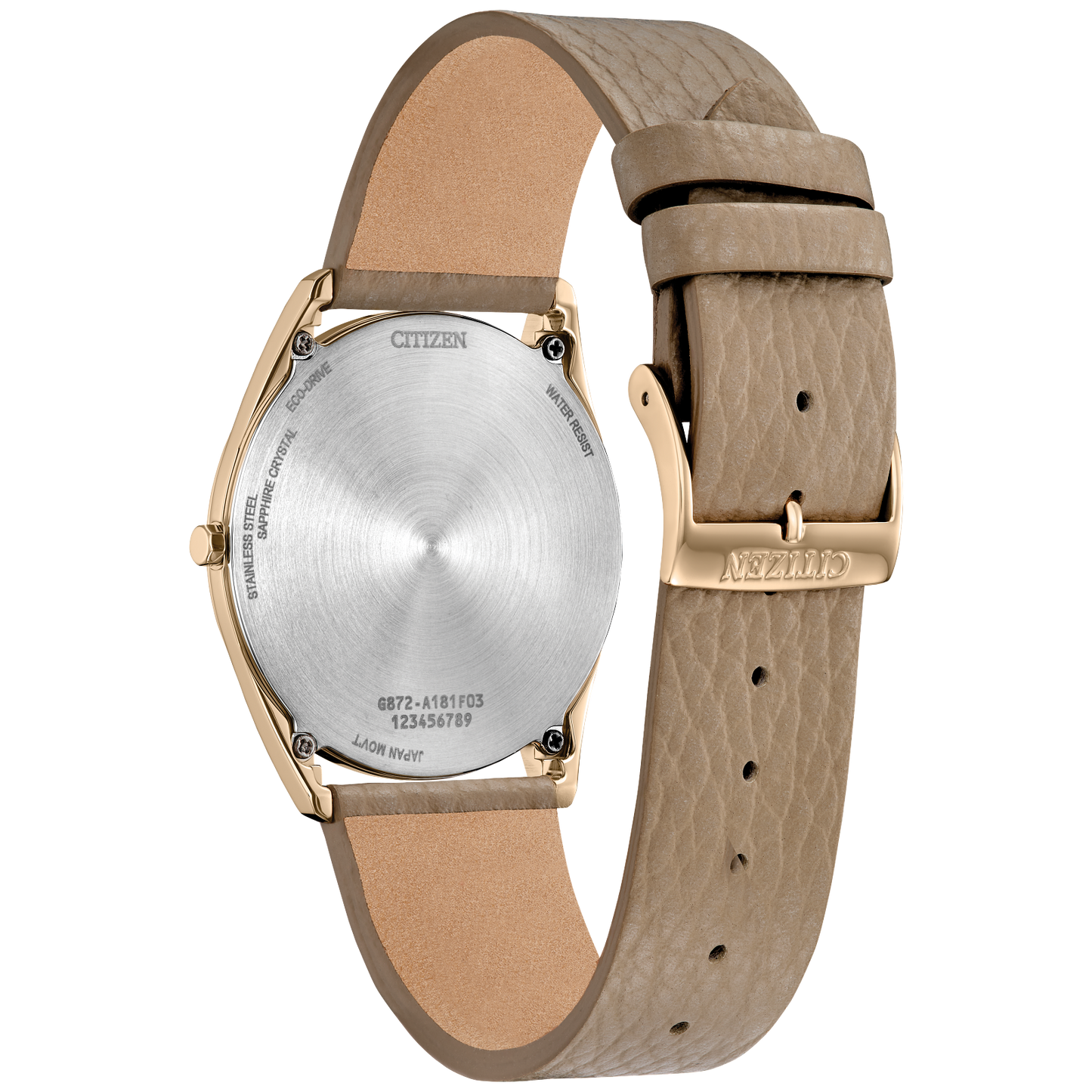 The CITIZEN SURATTO AR3123-00X is a stunning timepiece that blends contemporary minimalism with timeless elegance. Featuring a super-slim case, refined rose gold-tone aesthetics, and Eco-Drive technology, this watch delivers effortless sophistication without the hassle of battery replacements. Its sapphire crystal ensures superior durability, while the delicate pink dial and beige leather strap offer a touch of grace to any outfit.