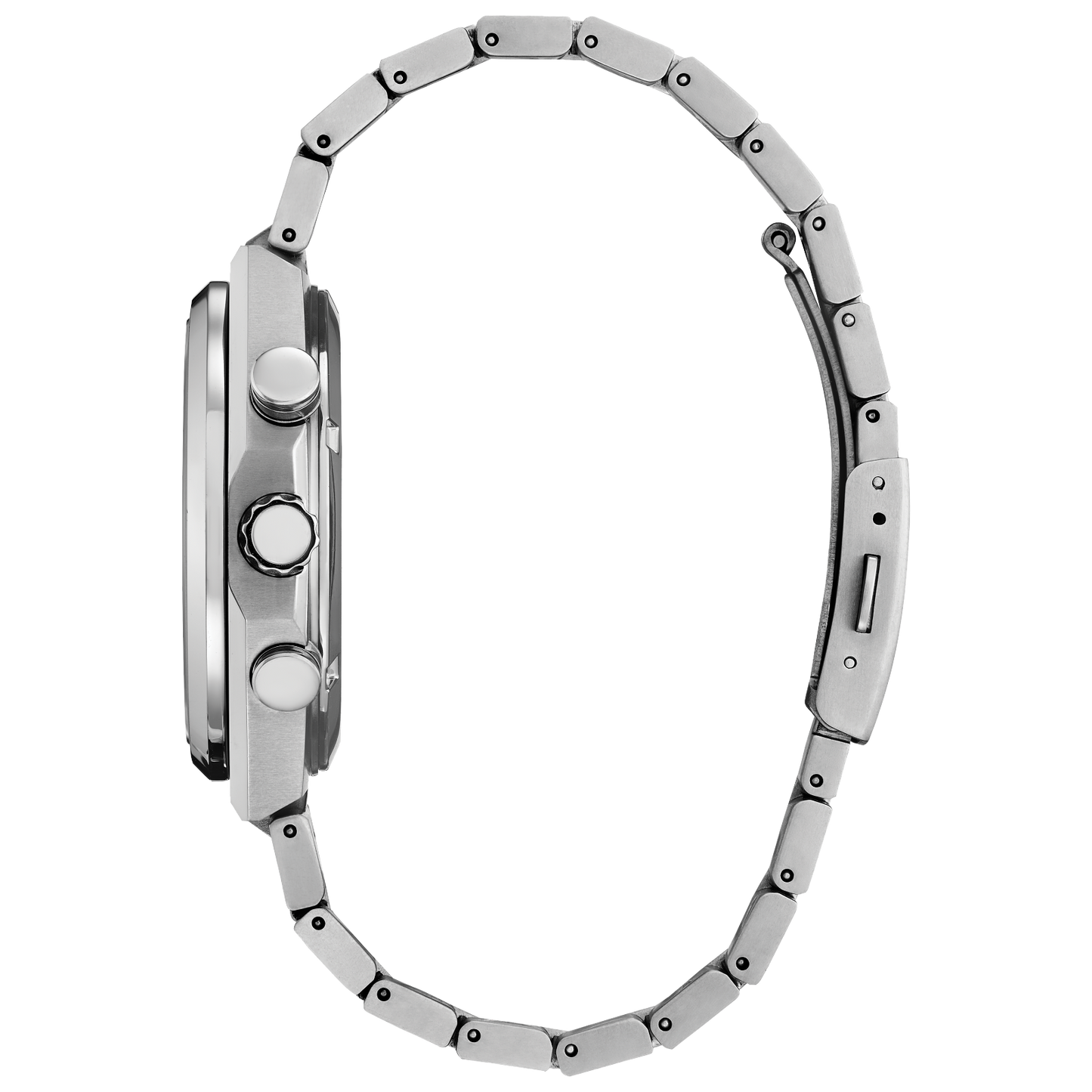 - Modern chronograph design with a 42.5mm silver-tone Super Titanium™ case