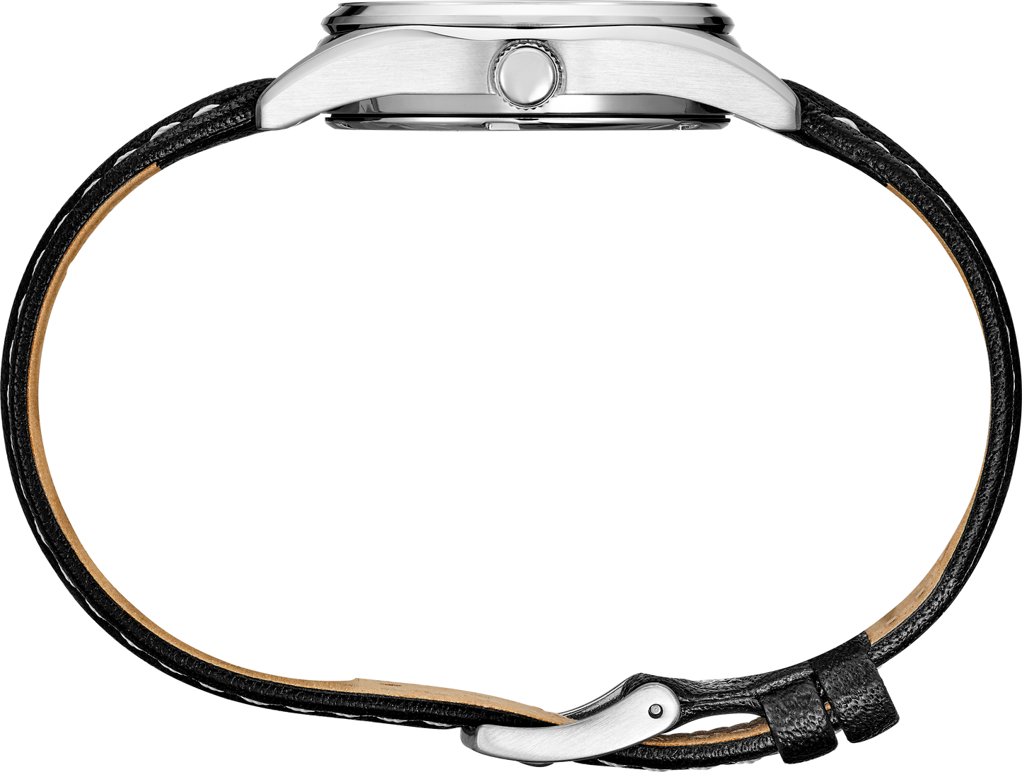 From the Essentials Collection. Offering classic dress/sport designs, in two sizes to suit anyone’s personal style, the Essentials Collection provides the ideal solution for everyday wear. Crafted of stainless steel with a scratch-resistant sapphire crystal, this perfectly balanced design features a contemporary minimalist silver-white sunray dial, day/date calendar, and LumiBrite hands and markers for superior visibility. To complete the tailored look, the black leather strap includes contrast stitching. 10 bar, 100M Water Resistant