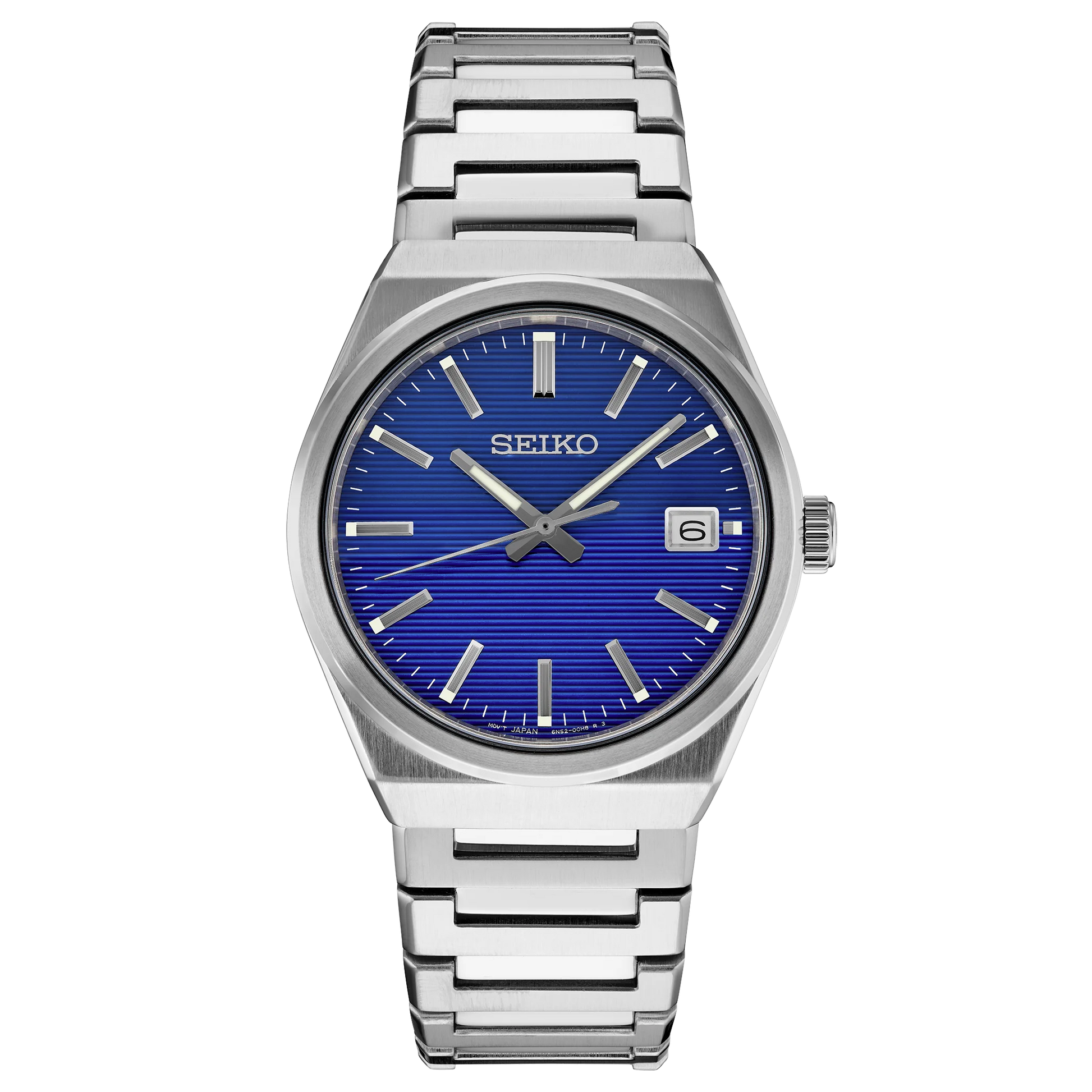 From the Essentials Collection. An updated classic, this sleekly angled watch features a vibrant blue pressed-pattern dial with simple stick indices, date calendar, and LumiBrite hands and markers. Crafted of stainless steel with a scratch-resistant sapphire crystal, this versatile timepiece includes a secure screwdown caseback and tri-fold push button release clasp. 10 bar, 100M Water Resistant