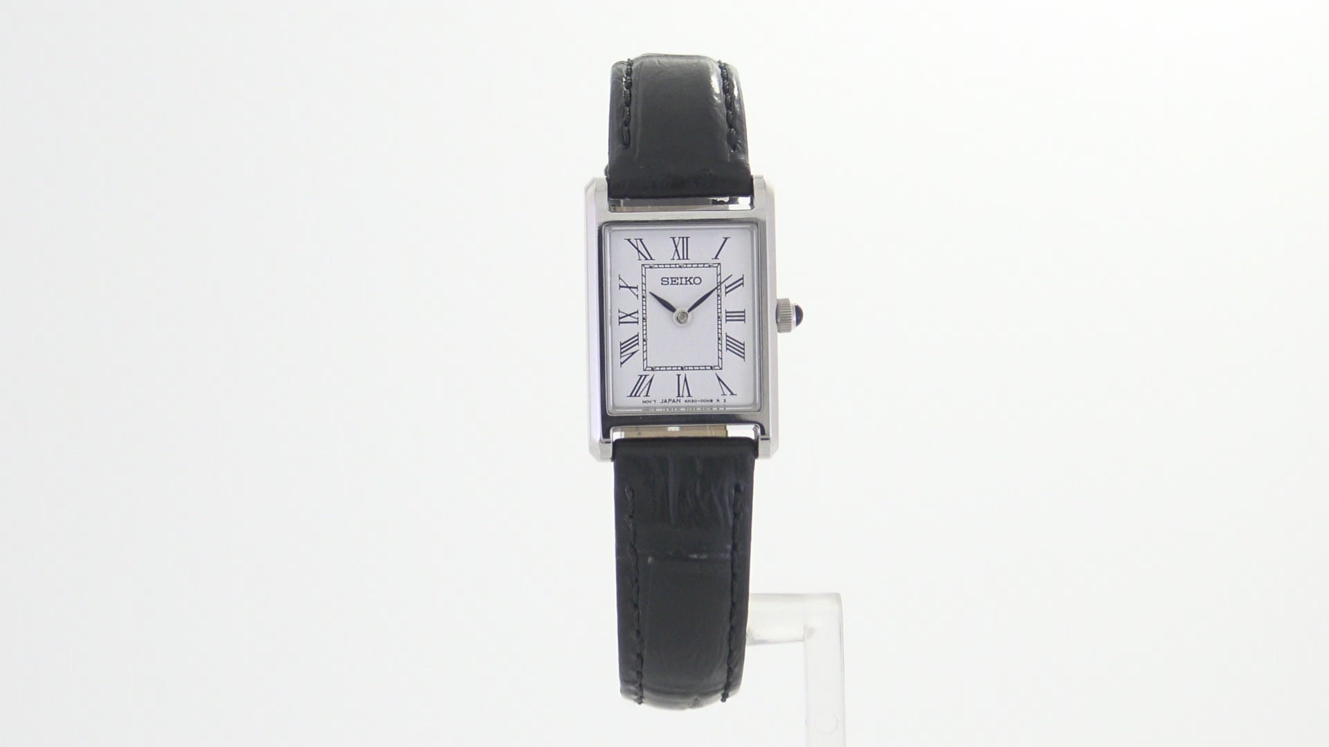 The Seiko SWR053 is an elegant watch from the Essentials Collection, featuring a sophisticated rectangular case, a white dial with Roman numerals, and a black leather strap, ideal for day-to-evening wear.