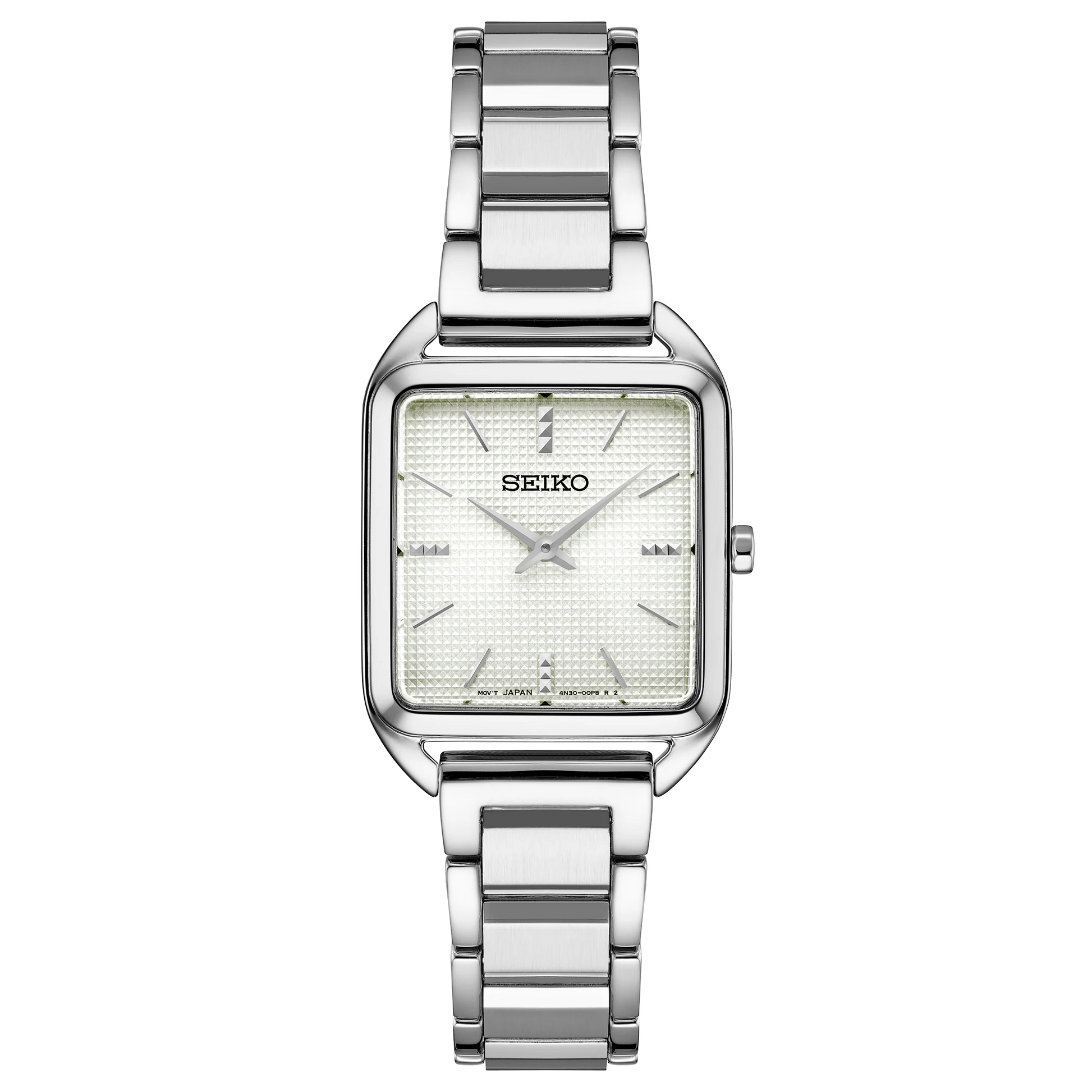 The Seiko SWR073 is an elegant, light, and slim watch from the Essentials Collection, featuring a sophisticated square case and a silver-white die-stamped grid pattern dial.