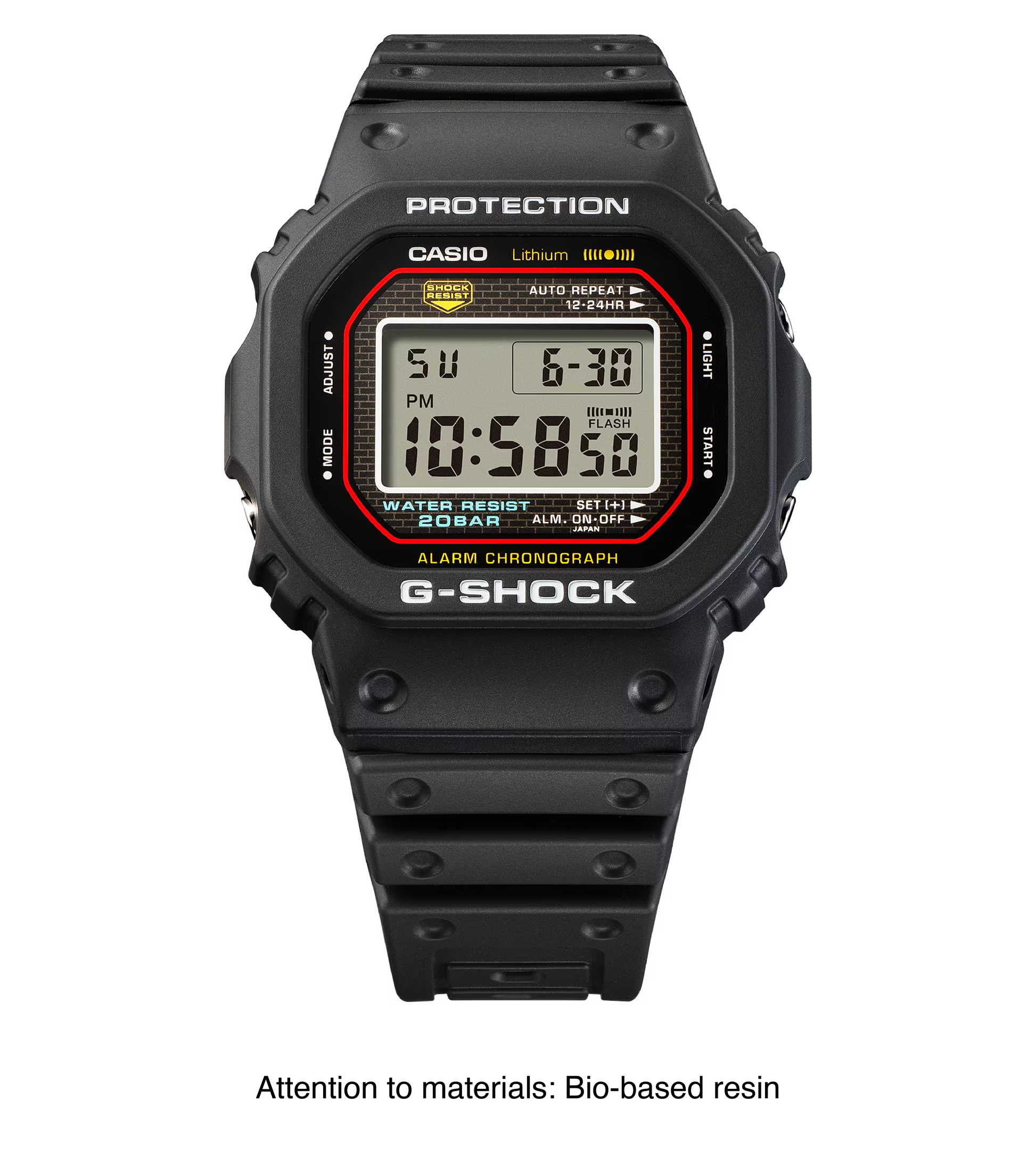 The DW5000R-1A stays true to the original 1983 G-SHOCK design, featuring a stainless steel case, iconic digital display, and the same textured band down to the smallest details. To honor G-SHOCK’s evolution, the bezel and band are now made of bio-based resin, an eco-conscious material aimed at reducing environmental impact.