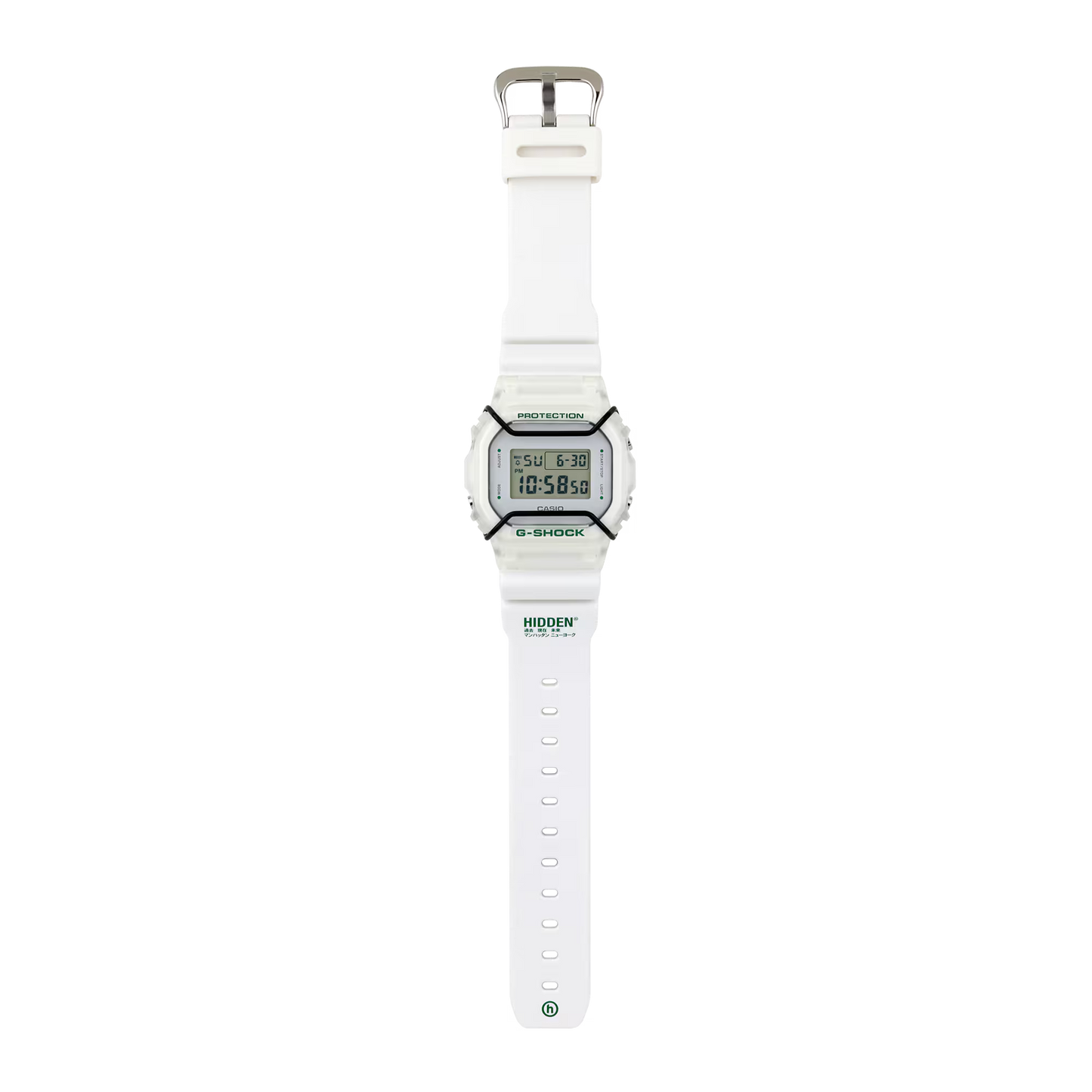 The DW5600HDN257 is the second collaboration between G-SHOCK and HIDDEN NY, bringing together streetwear culture and iconic toughness. Built on the legendary DW5600 silhouette, this model features HIDDEN NY’s signature white and green colorway paired with a minimalist design. More than a watch, it’s a statement piece that blends utility, style, and cultural relevance.