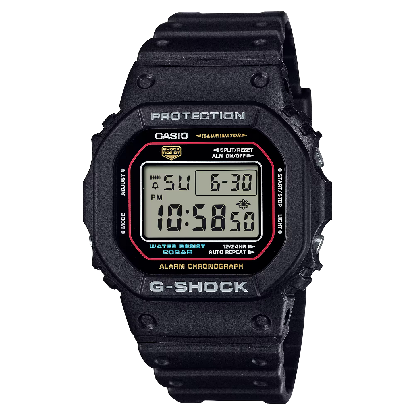 The DW5600RL-1 showcases the classic square face of the 5600 series, adorned with the original G-SHOCK colors: