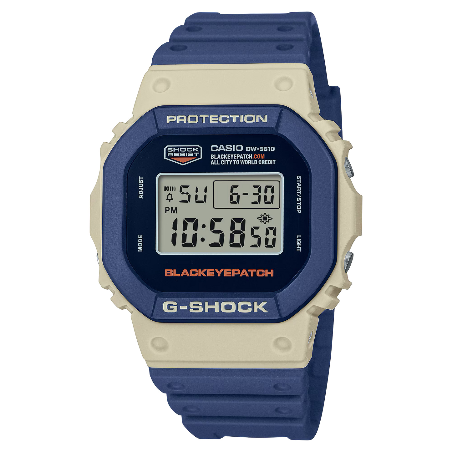 The DW5610BEP-2 is a special collaboration model between G-SHOCK and Tokyo streetwear brand BlackEyePatch. Combining industrial design with iconic graphics, this watch stays true to the legendary DW-5610 form while incorporating a workwear-inspired color scheme.