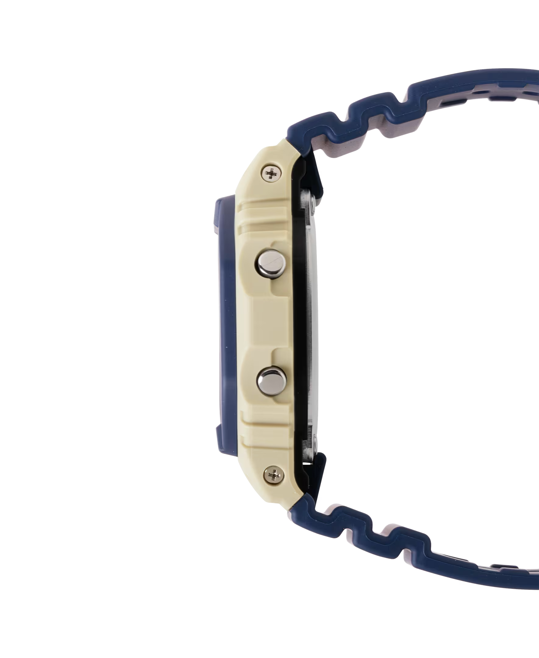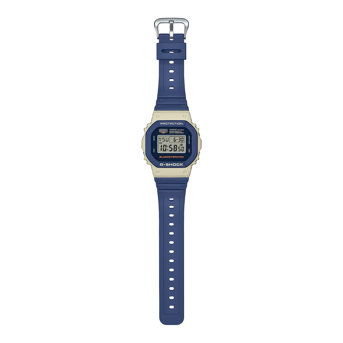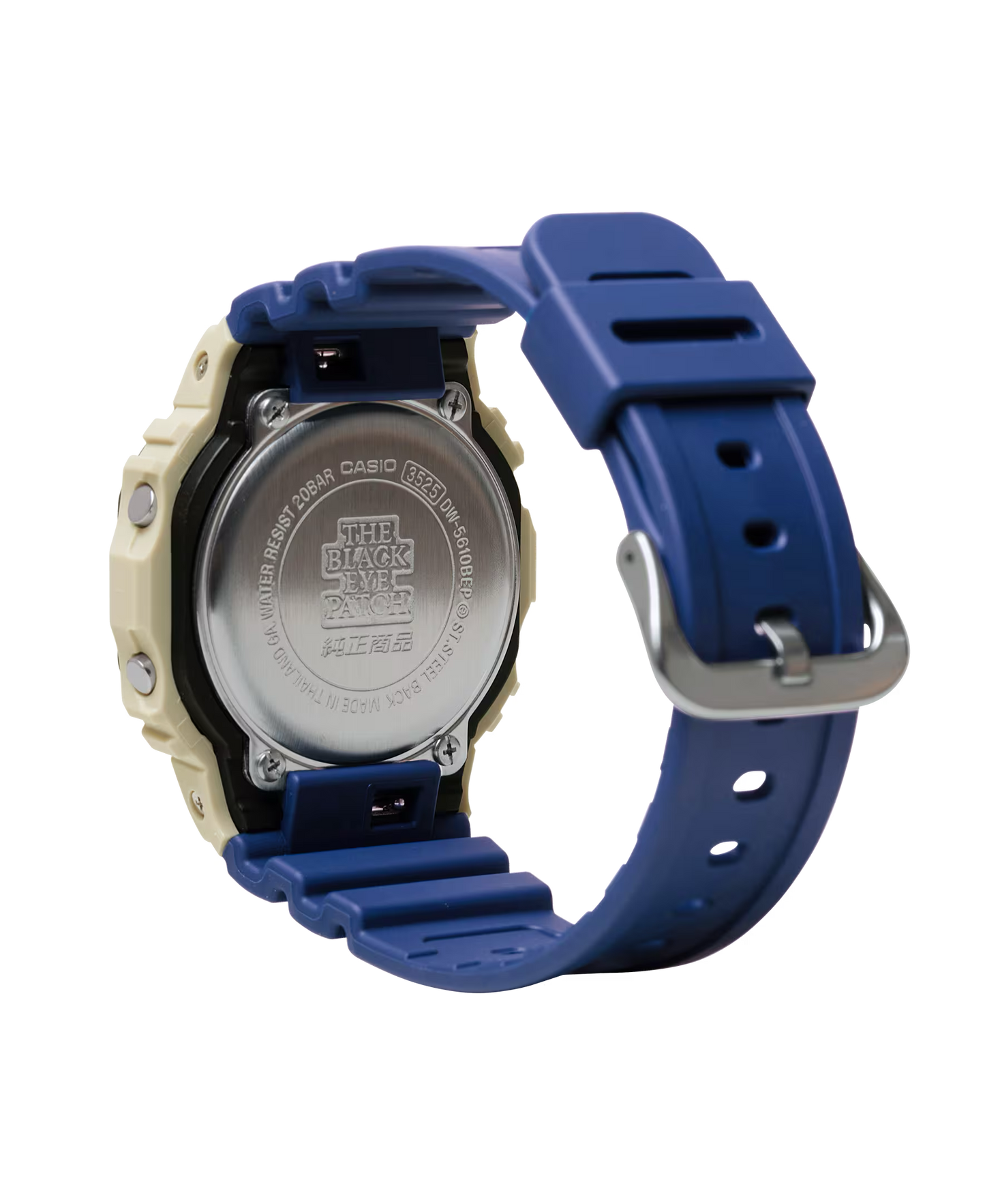The DW5610BEP-2 features a navy and beige base with accents of orange, reflecting colors commonly found in workwear. The case back is etched with the “Genuine Article” tag from BlackEyePatch, and the same phrase is revealed as a backlight graphic when the LED is activated. The rugged resin construction ensures durability, while the bio-based resin band adds an eco-conscious element.