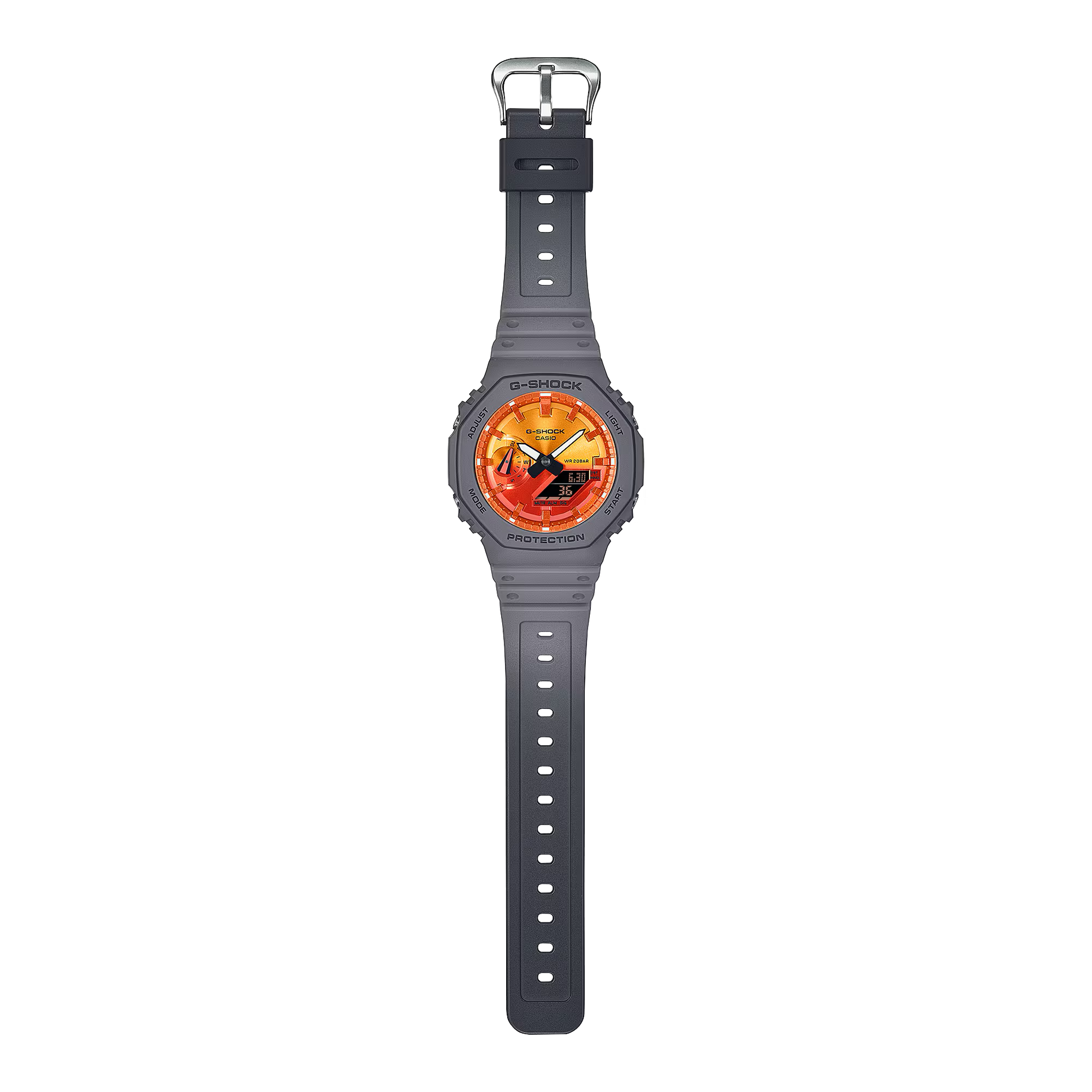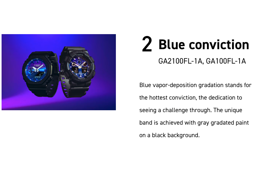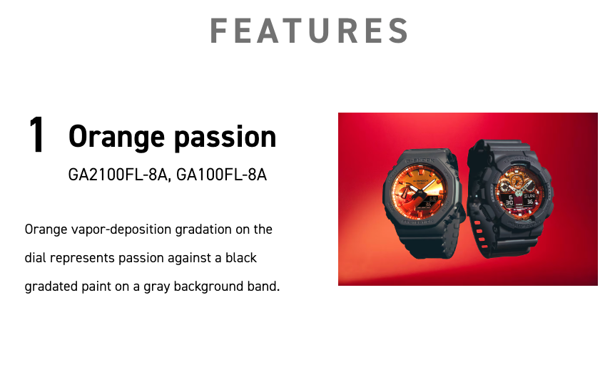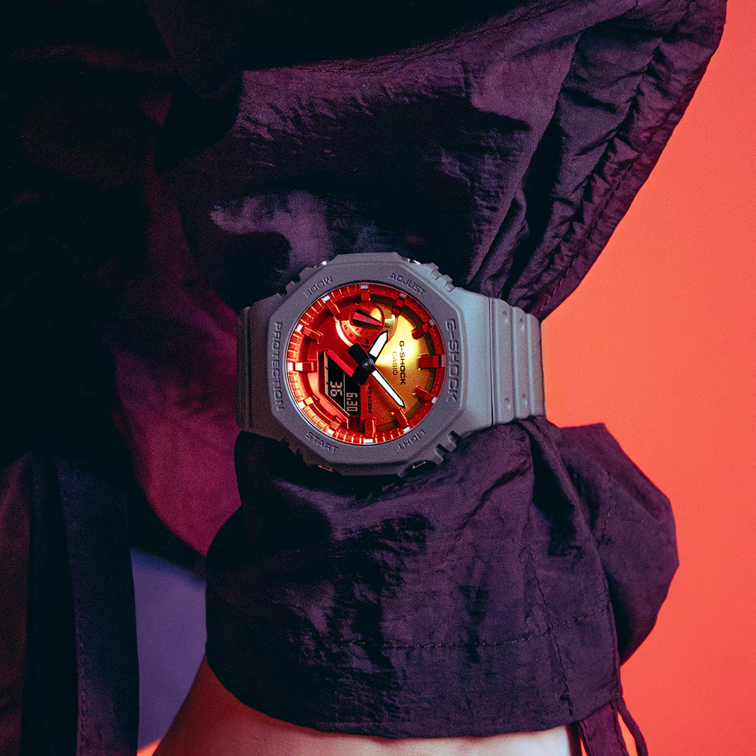 The GA-2100FL-8A is part of the Flame Inside Line, embodying G-SHOCK’s fiery and bold aesthetics. Designed to symbolize the blazing passion of challenges and resilience, this model features a distinctive octagonal case with a striking flame-inspired gradient design.