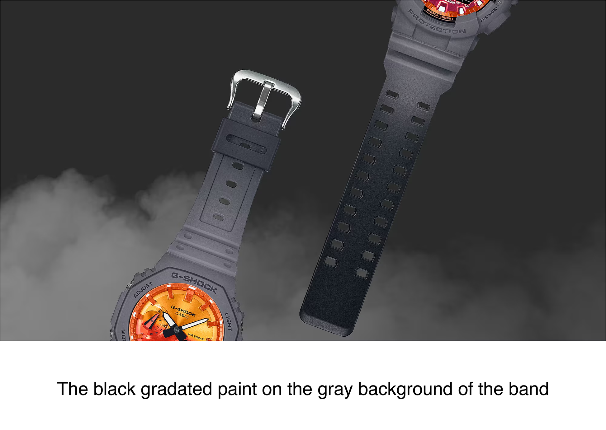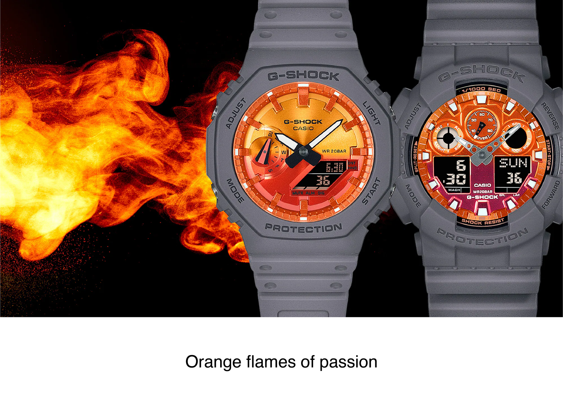 The GA-2100FL-8A boasts a bold orange dial with a gradated black-on-gray body, evoking flames against a dark smoky backdrop. The unique motif of billowing smoke on the band further enhances its dynamic and intense appearance.