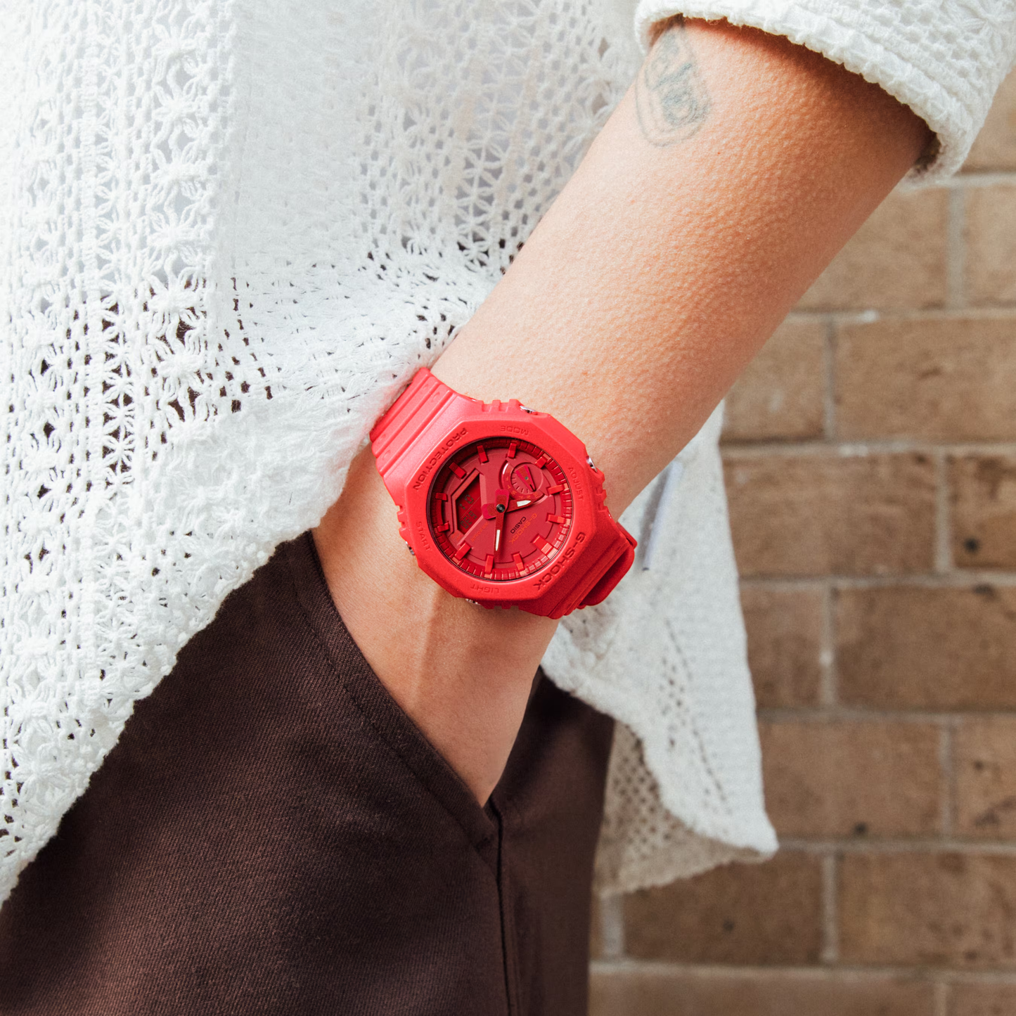 The GA2100-4A is an analog-digital combination model from G-SHOCK, designed with a slim and lightweight carbon core guard structure. This vibrant red timepiece merges toughness with a sleek, modern aesthetic.