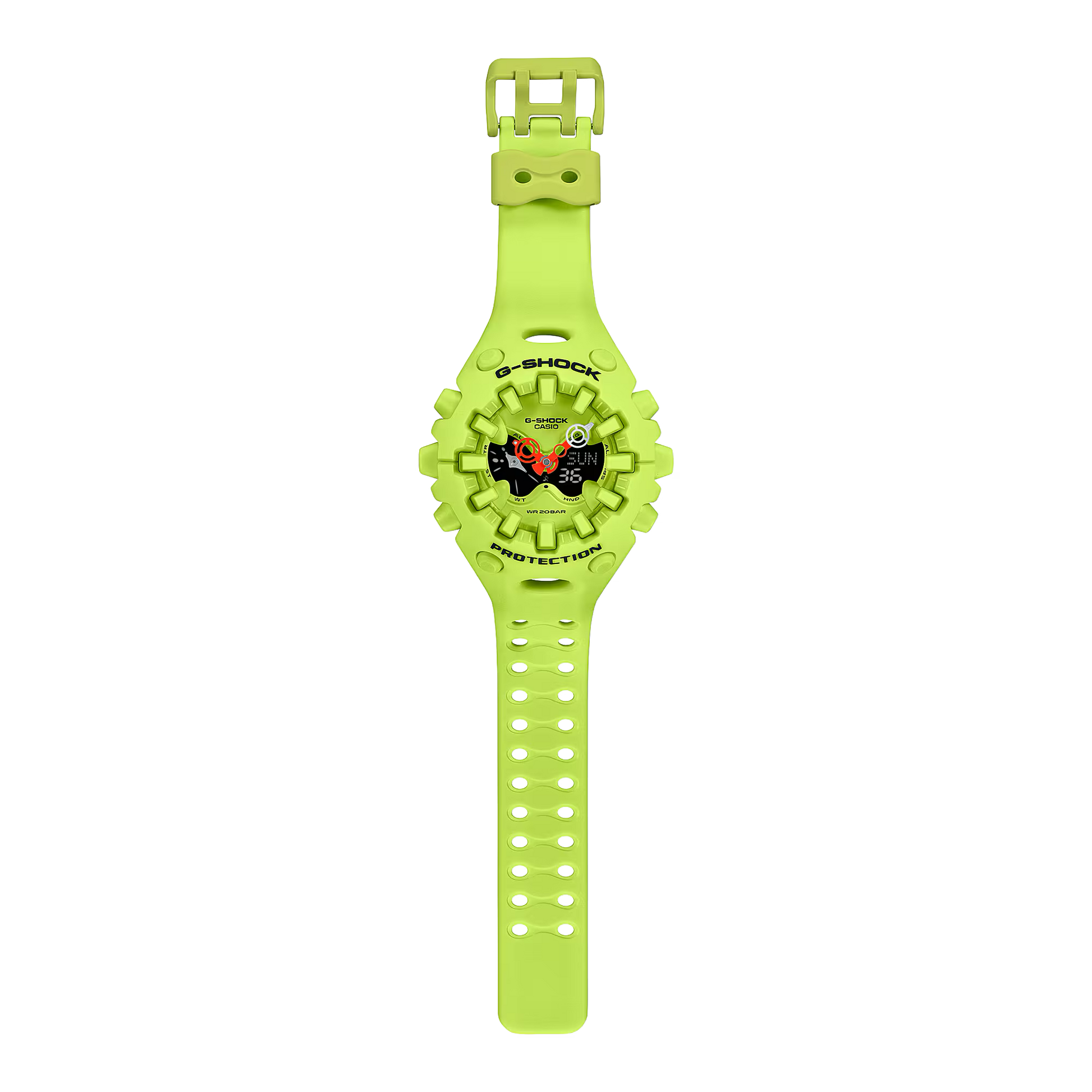 The GAV01-9A showcases an organic, sculpted exterior with sharp edges, paired with a large full-screen LCD topped by a metallic dial with openwork detailing. Its vivid neon yellow case delivers a fearless style statement, while remaining true to the rugged G-SHOCK identity.