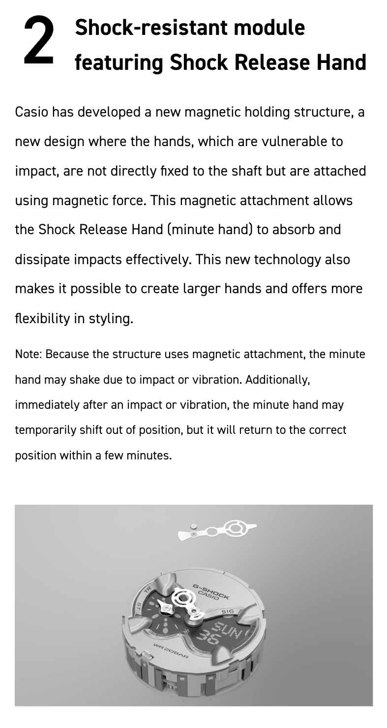 At the core of this innovative watch is Casio’s magnetic holding structure, which attaches the hands using magnetic force instead of a fixed shaft. This groundbreaking feature allows the Shock Release Hand to absorb and dissipate impact energy, protecting the mechanism while enabling bold hand styling and flexible designs.