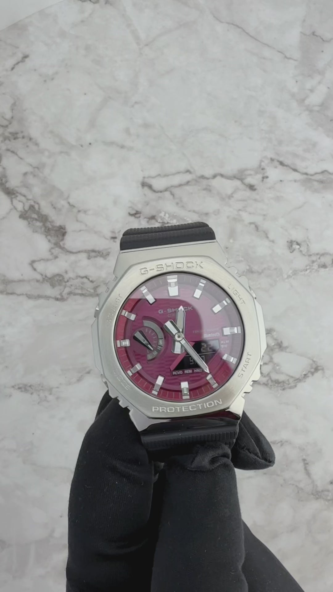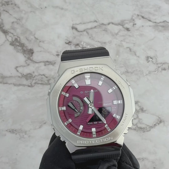 The GBM-2100A-4B delivers bold metal styling with advanced technology in a compact form. Featuring a striking burgundy dial with silvery indexes, this G-STEEL model combines sophistication with the toughness G-SHOCK is known for.