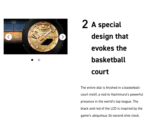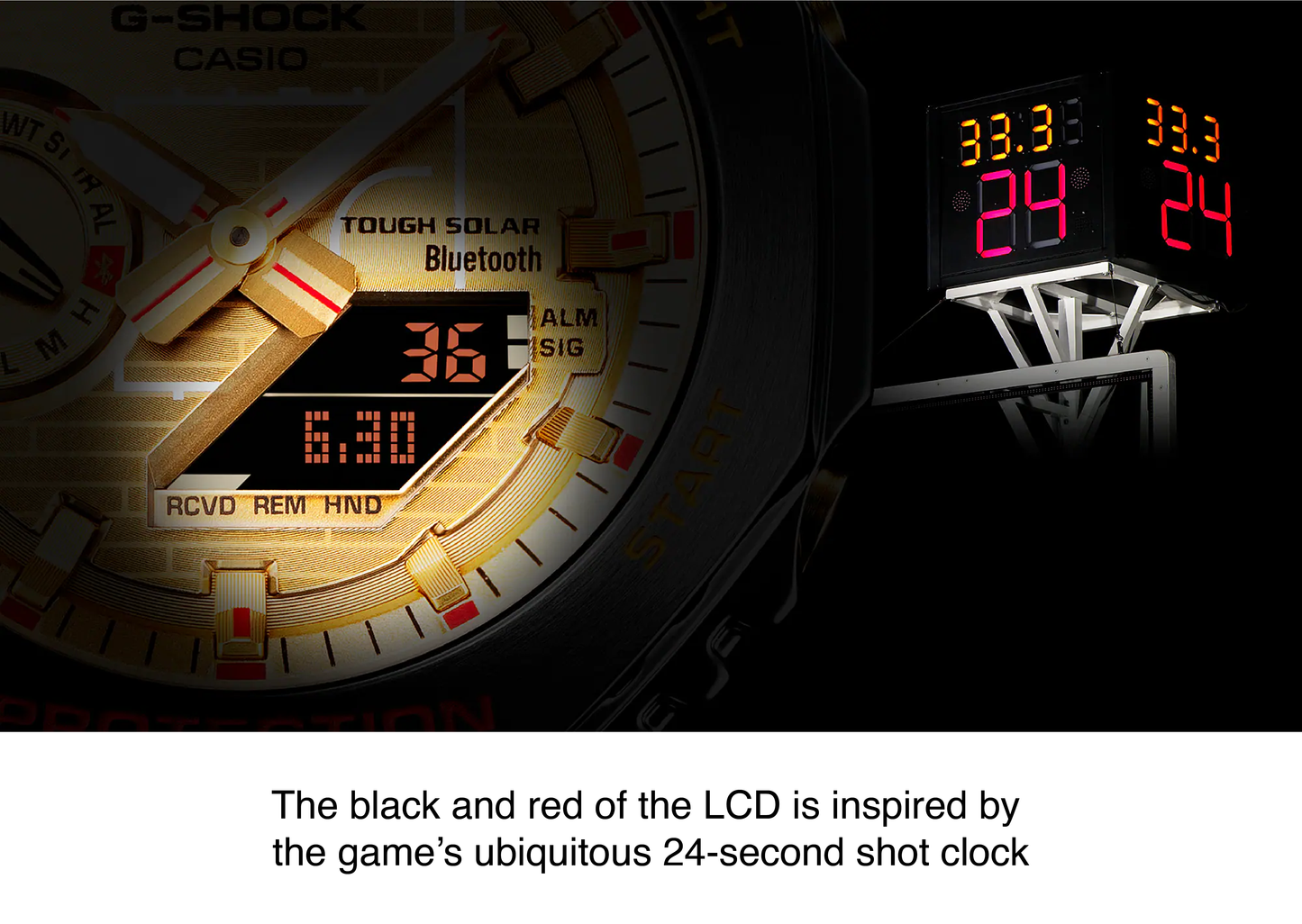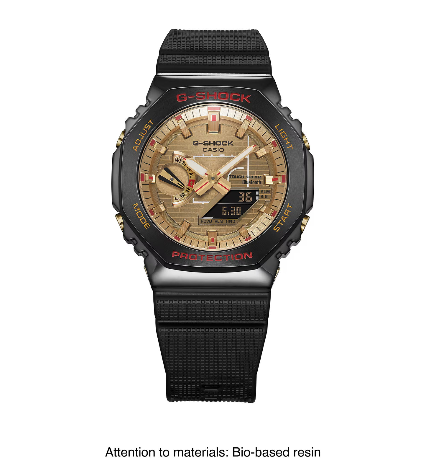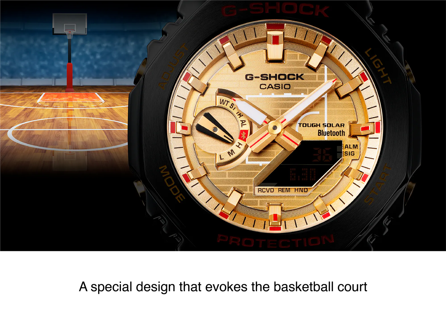 The GBM2100RH-1A is the fourth signature model by professional basketball player Rui Hachimura, blending toughness with bold design elements inspired by his passion for the game. This collaboration combines sportiness, cultural symbolism, and cutting-edge technology for a timepiece that celebrates strength and style.