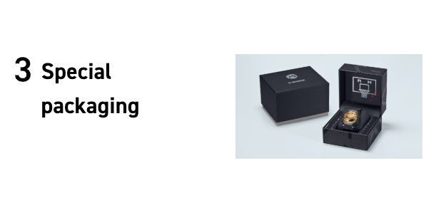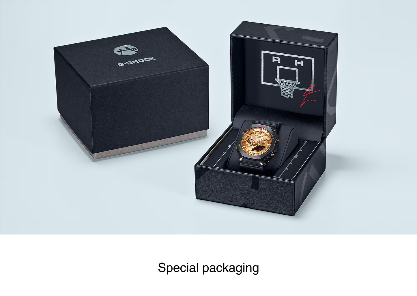 The GBM2100RH-1A features a black metal bezel with bold red accents inspired by Rui Hachimura’s personal style and the iconic G-Shock brick wall motif. Rui’s signature “八” (hachi, meaning “eight” in Japanese) is engraved on the case back and subtly placed on the side button, symbolizing his jersey number and cultural heritage.