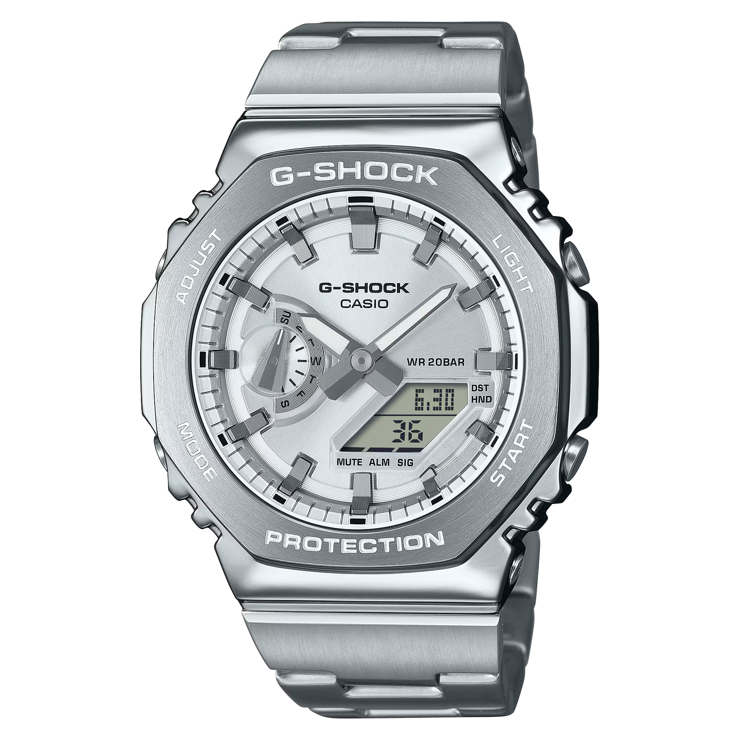 The GM2110D-7A is a perfect fusion of toughness and elegance, blending the rugged durability of G-SHOCK with the premium aesthetics of stainless steel. With its polished silver-tone dial, stainless-steel bezel and band, and advanced features like world time, alarms, and dual LED lighting, this sophisticated yet robust timepiece is a must-have for those who appreciate both style and performance.