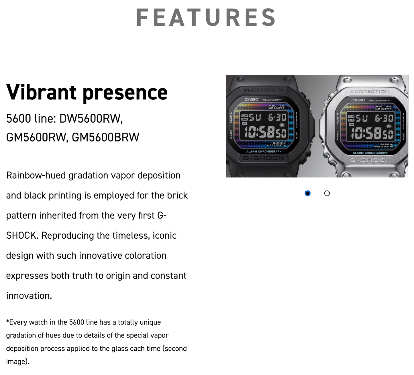 The GM5600BRW-1 is a bold and stylish addition to the G-STEEL 5600 Series, featuring a rainbow vapor deposition design that brings a vibrant, color-shifting brick wall pattern to the watch glass and dial. This design pays homage to the very first G-SHOCK, symbolizing the spirit of toughness and resilience.