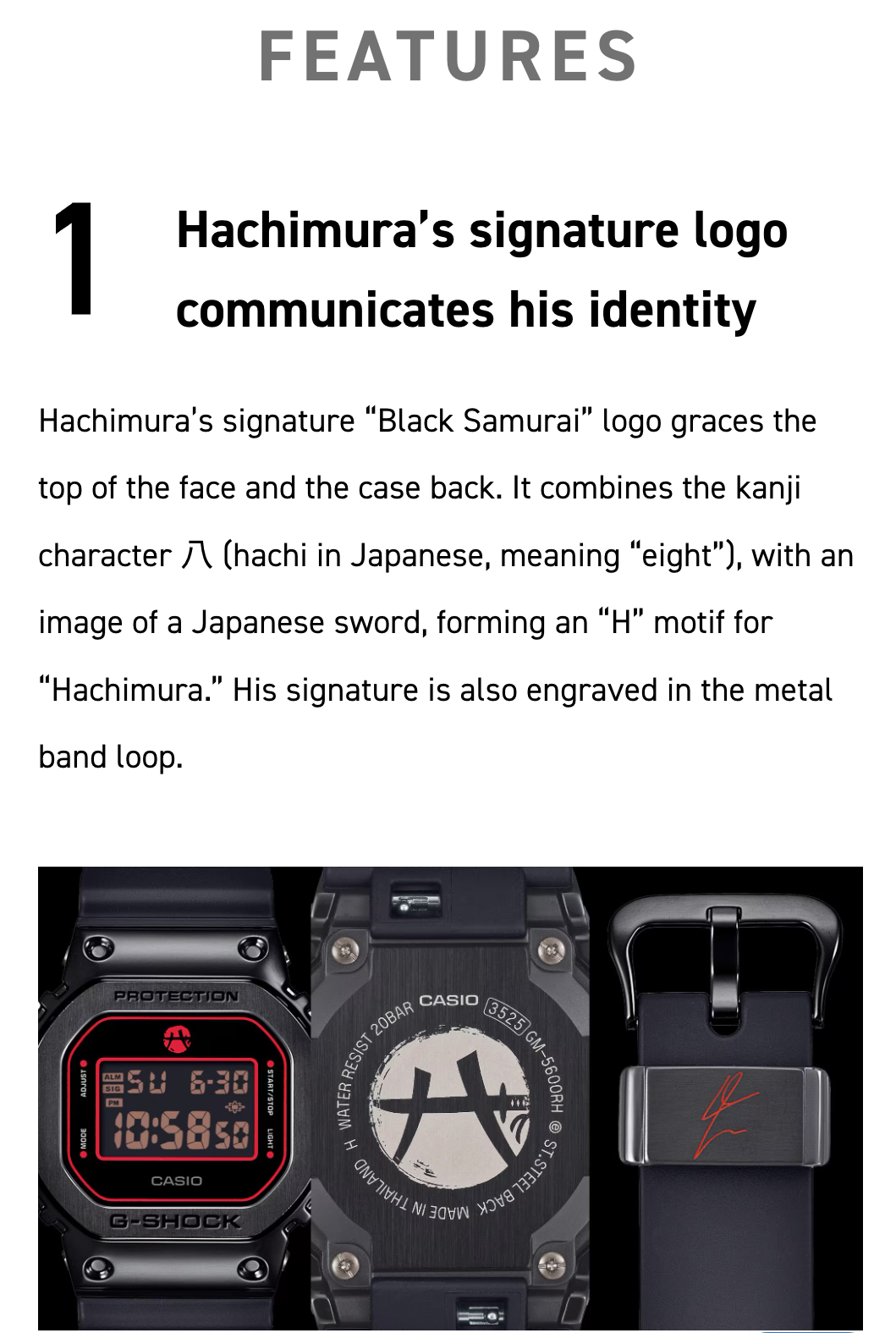 The GM5600RH-1 highlights Rui Hachimura’s personal identity and Japanese heritage. His exclusive “Black Samurai” logo—combining the kanji character 八 (hachi, meaning “eight”) with the image of a Japanese sword to form an “H” for Hachimura—adorns the dial and case back. His signature is also engraved on the band loop for an authentic personal touch.