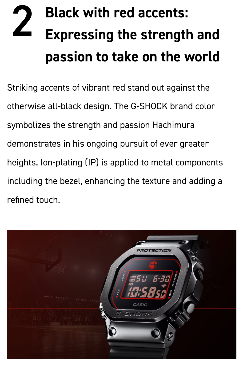 G-SHOCK and Rui Hachimura reunite for their fifth signature collaboration with the GM5600RH-1. This special edition builds on the classic GM5600, featuring a bold ion-plated metal bezel and Rui’s signature “Black Samurai” branding. With a powerful black and red color scheme, this watch reflects Hachimura’s strength, intensity, and journey as he continues to rise to new heights.
