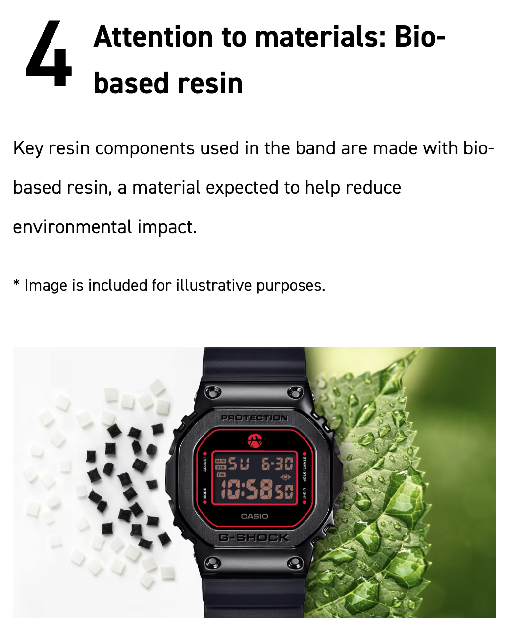The ion-plated bezel and metal components add refined texture, while the bio-based resin band emphasizes environmental consciousness. Packaged in a striking black-and-red presentation box, this model is both a high-performance timepiece and a collector’s edition.