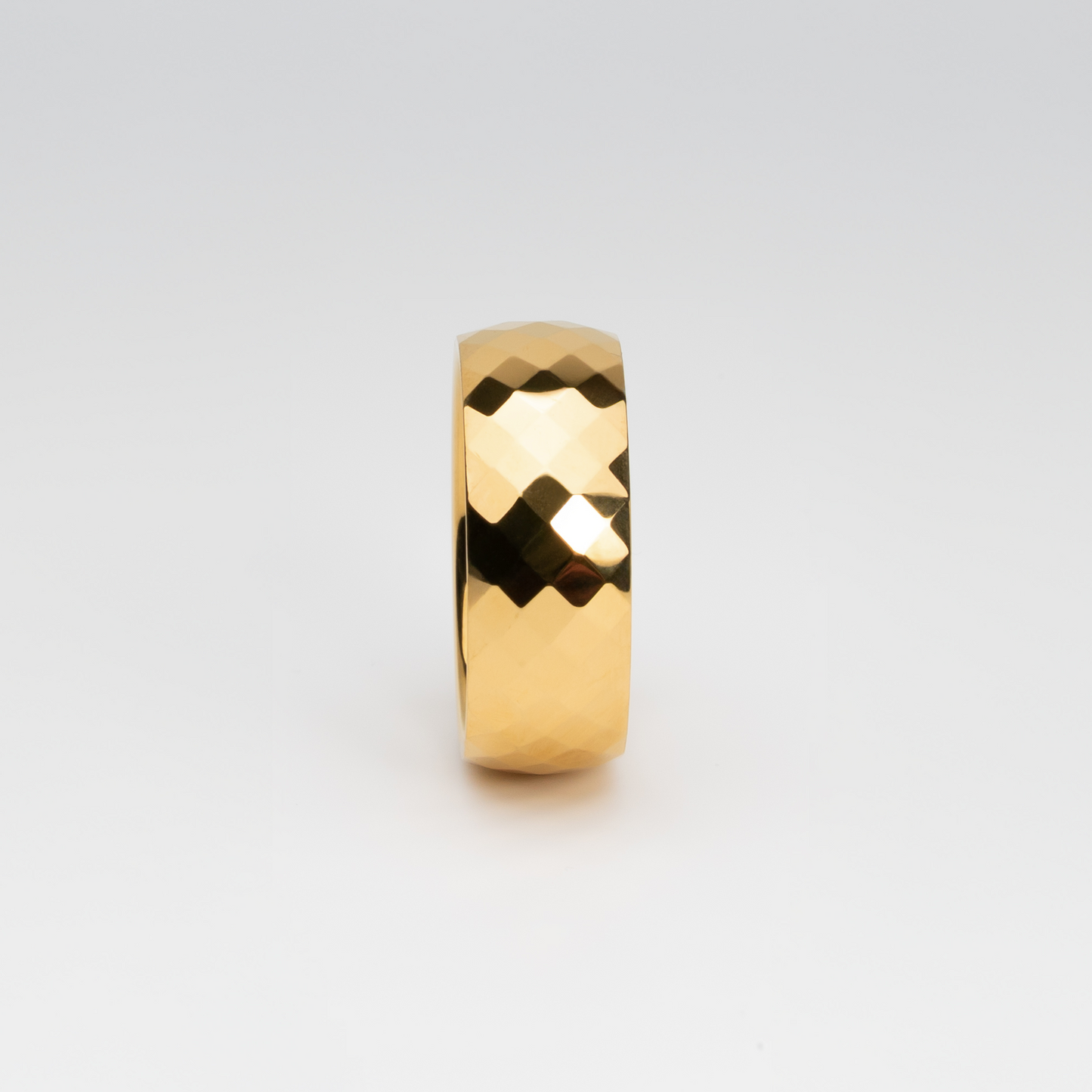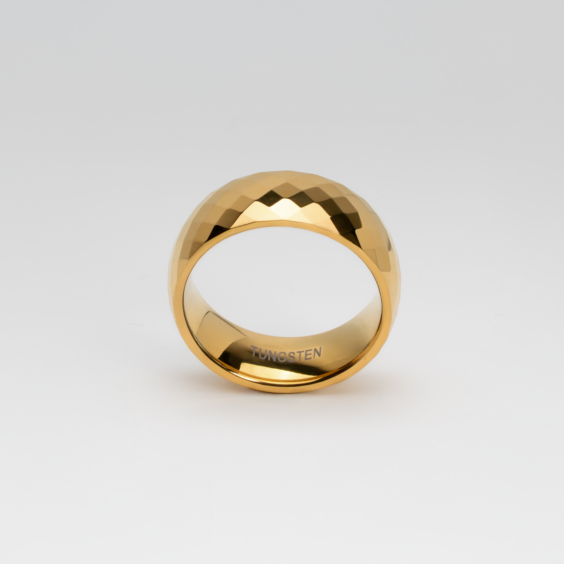 This gold tungsten carbide ring features a stunning faceted design, creating a bold yet sophisticated look. The multi-faceted surface enhances light reflection, giving it a dynamic shine that changes with every movement. Its high-polish gold finish adds a luxurious touch, making it an excellent choice for weddings, anniversaries, or statement fashion wear.