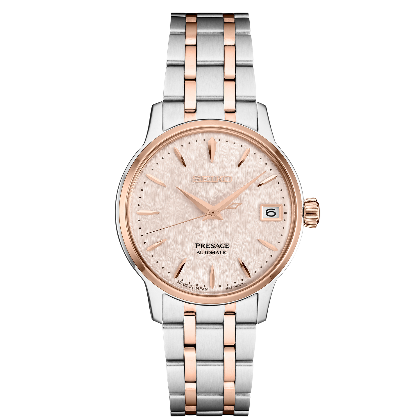 Seiko Presage Cocktail Time. Offering the finest in Japanese mechanical watchmaking, the Presage Collection blends precision technology with superior craftsmanship and design. Offering a feminine twist to the popular Cocktail theme line, this charming watch, inspired by the Pink Champagne cocktail, features a pink dial with a pressed pattern evoking crushed ice and a sugar garnish. The 23-jewel movement, with manual and automatic winding capability, beats at a frequency of 21,600 vibrations per hour, with a power reserve of approximately 41 hours. Crafted of stainless steel with rose-gold two-tone finish, this distinctive timepiece includes a calendar, box-shaped crystal, screwdown see-through caseback, and tri-fold push button release clasp. 5 bar, 50M Water Resistant