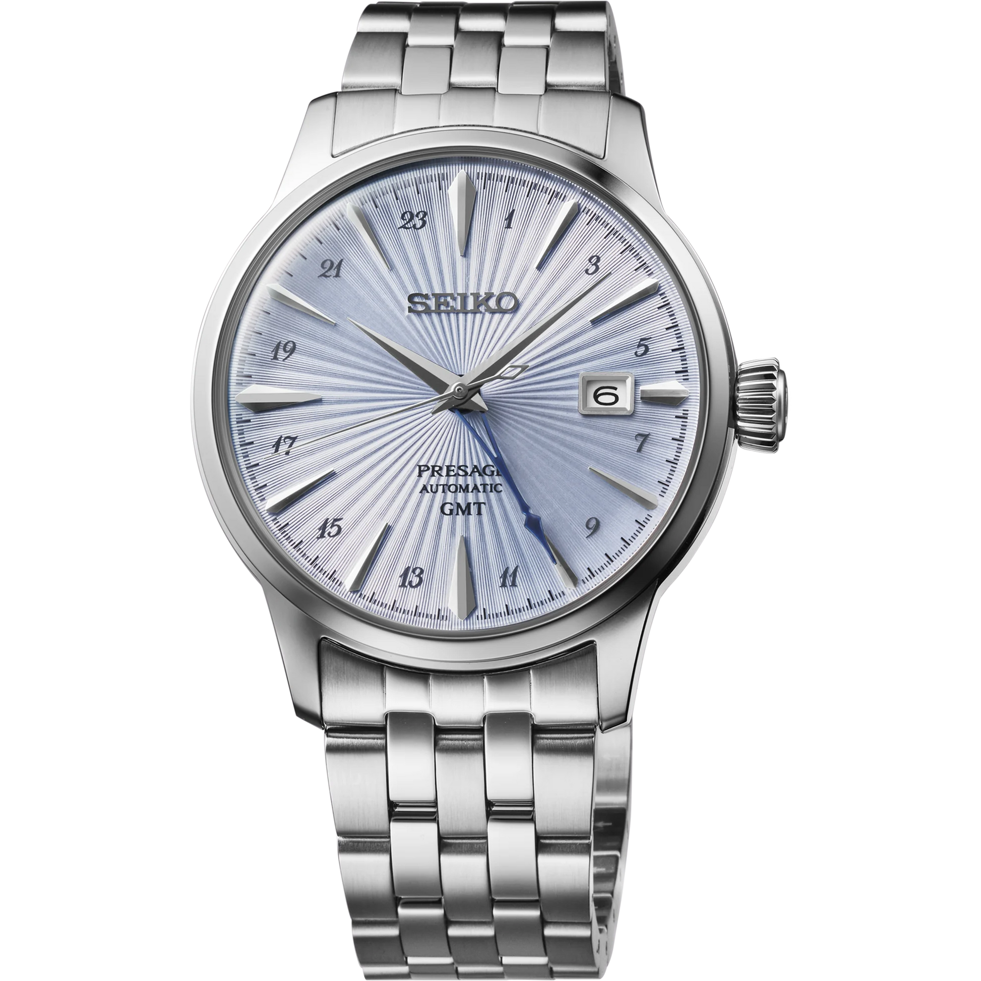 The SEIKO SSK037 is a Presage Cocktail Time GMT watch, inspired by the vibrant Tokyo cocktail scene. It features a light blue dial with a deep pressed pattern and a vibrant blue GMT hand shaped like a cocktail glass.