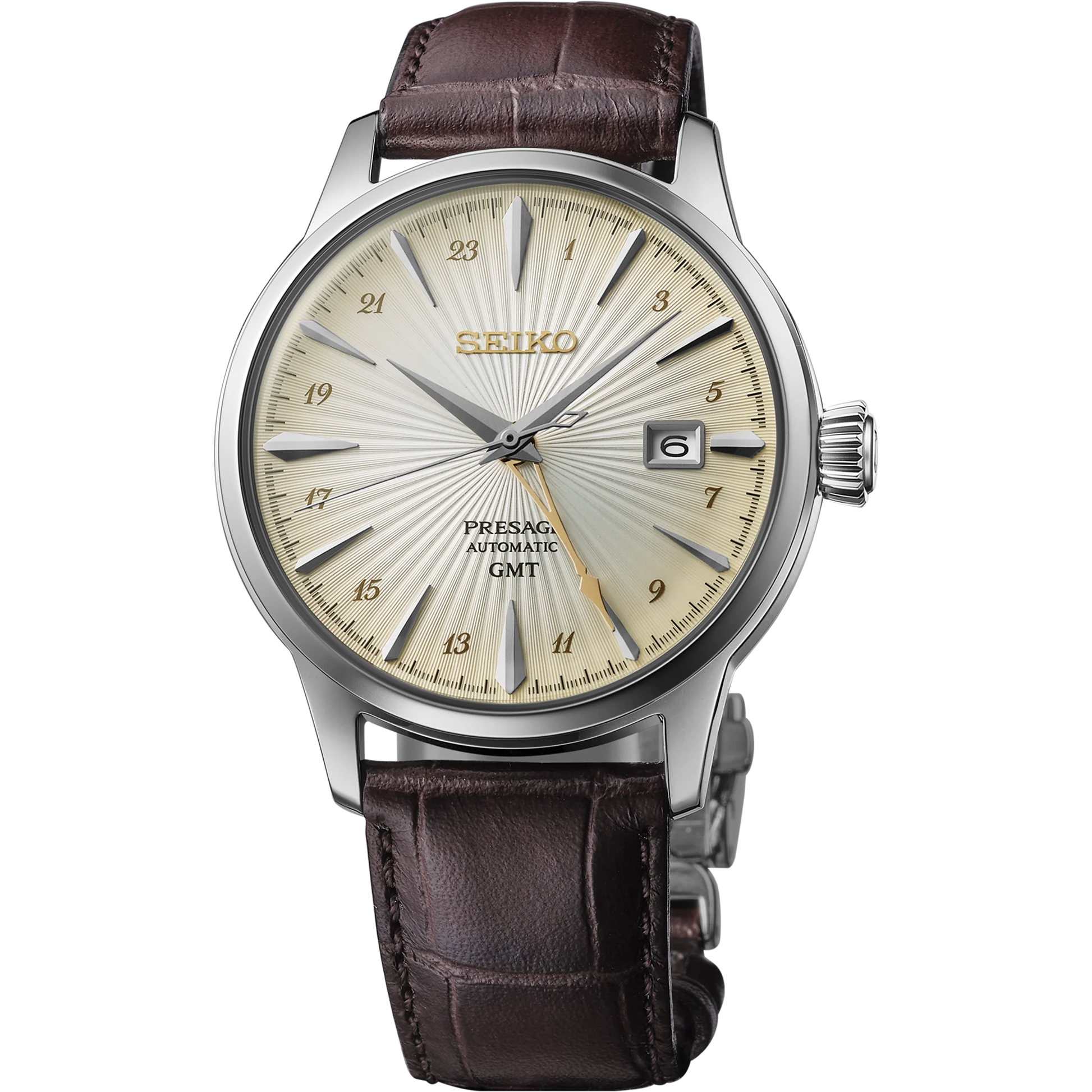 The SEIKO SSK041, part of the Presage Cocktail Time GMT collection, is inspired by the "Acacia" cocktail. It features an ivory dial with a deep pressed pattern and a gold-tone GMT hand shaped like a cocktail glass.