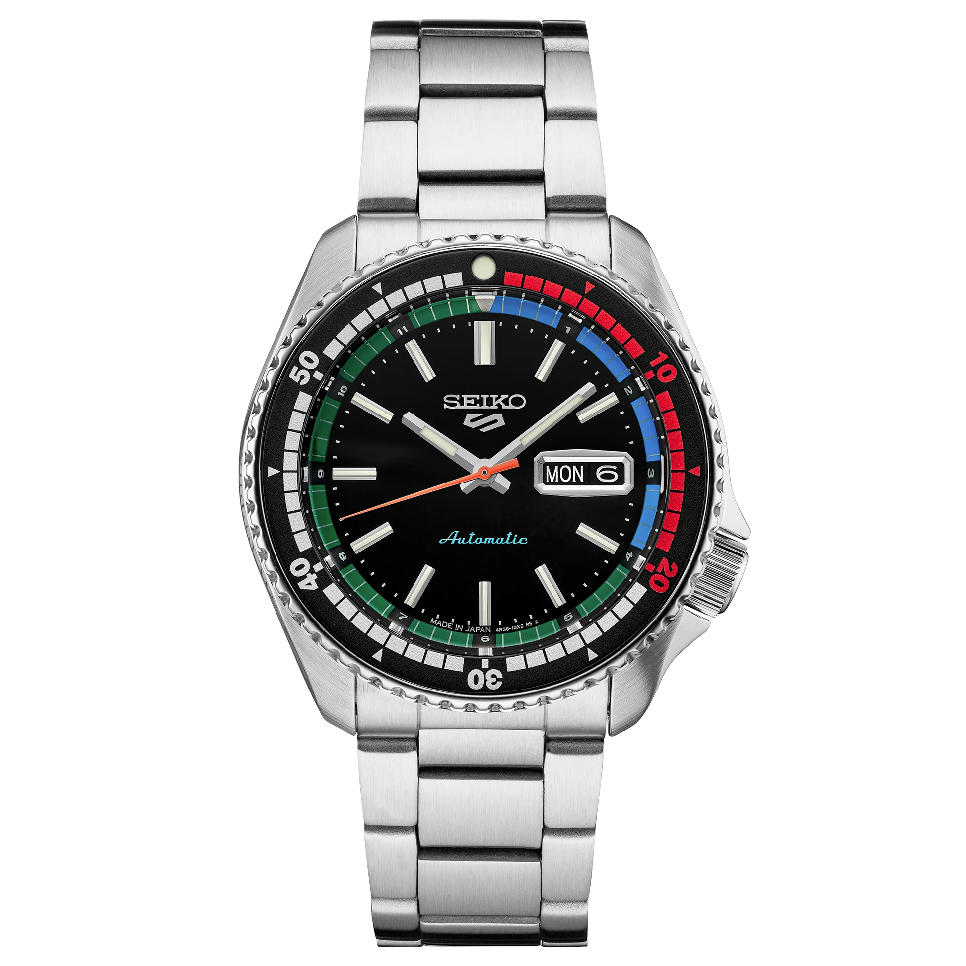 Seiko 5 Sports Special Edition. Inspired by the popular model 6119-6050 of the late-’60s, this dynamic watch offers current styling with a vintage feel, featuring an updated case and streamlined dial, while retaining the original’s black, blue, green and red color scheme. Framed by a black uni-directional rotating bezel with red and silver accents, the dial includes a day/date calendar, red-orange second hand, blue, green and red accents, and luminous hands and markers. Providing automatic technology that you control with every movement, the 24-jewel movement, visible through the screwdown see-through caseback, beats at a frequency of 21,600 vibrations per hour, with a power reserve of approximately 41 hours and manual winding capability. In stainless steel with locking tri-fold push button release clasp. 10 bar, 100M Water Resistant