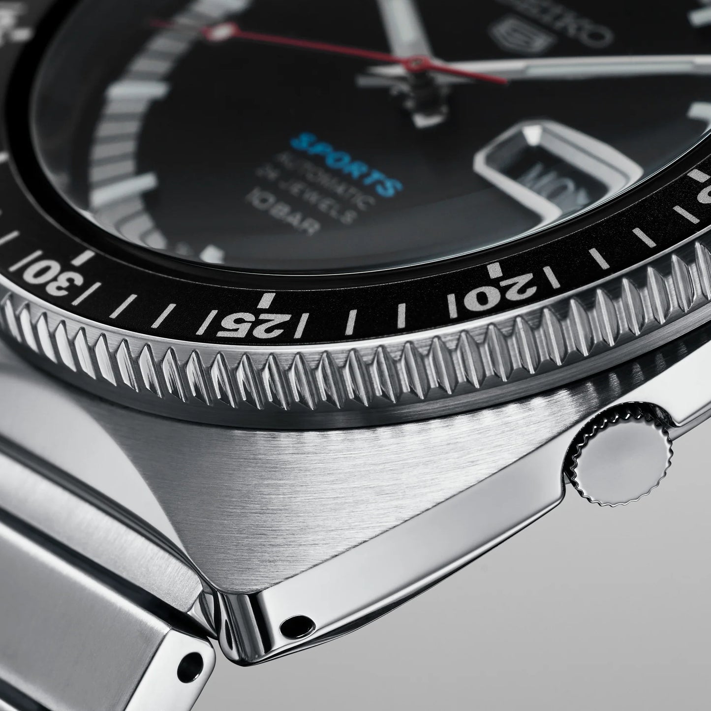 - Dial: Black dial with the original Seiko 5 logo and "SPORTS" at 6 o’clock.