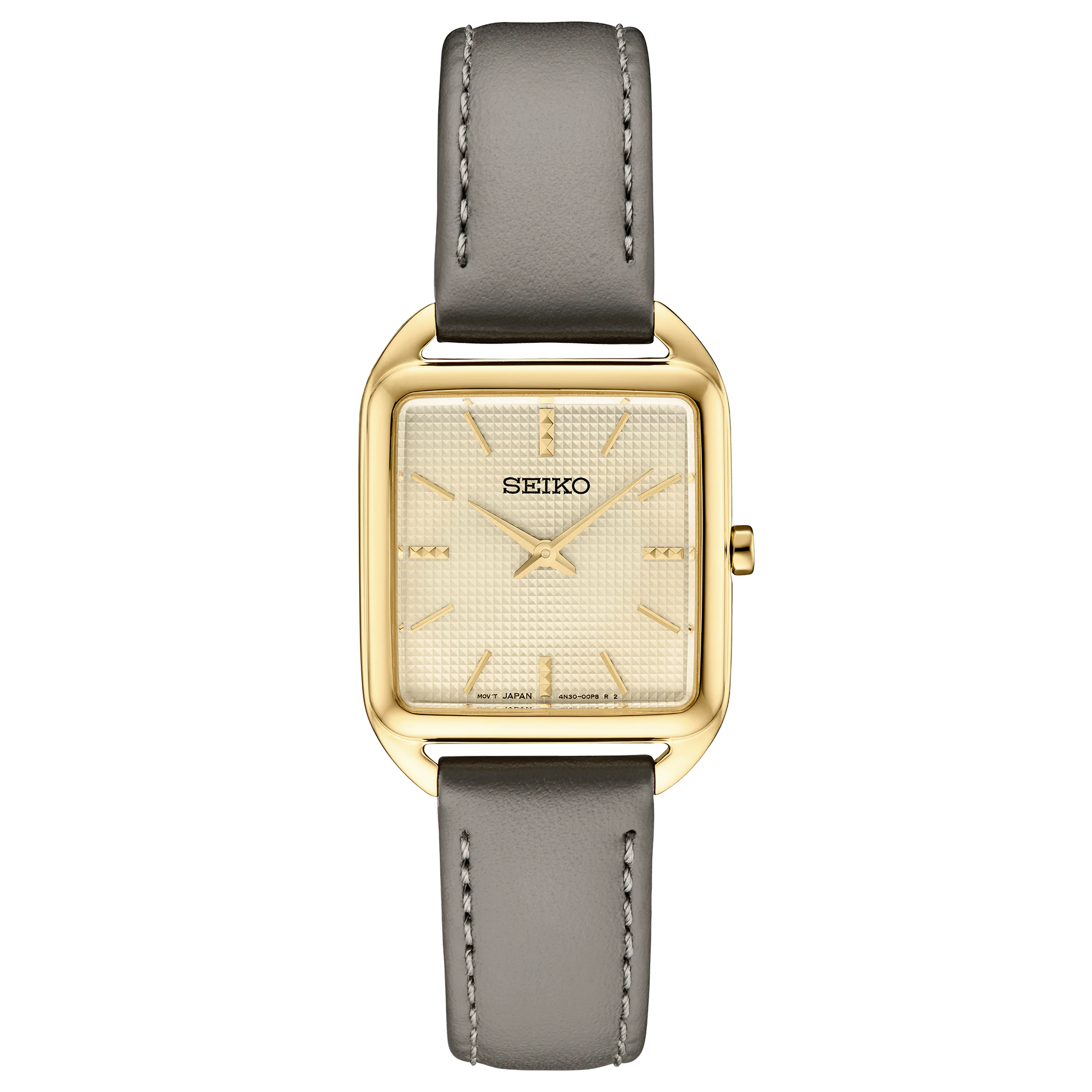 The Seiko SWR090 is a refined and elegant watch from the Essentials Collection, featuring a light champagne dial with a die-stamped grid pattern, gold hands and markers, and a sophisticated square case design. It is crafted with a stainless steel case with a gold finish and paired with a gray leather strap.