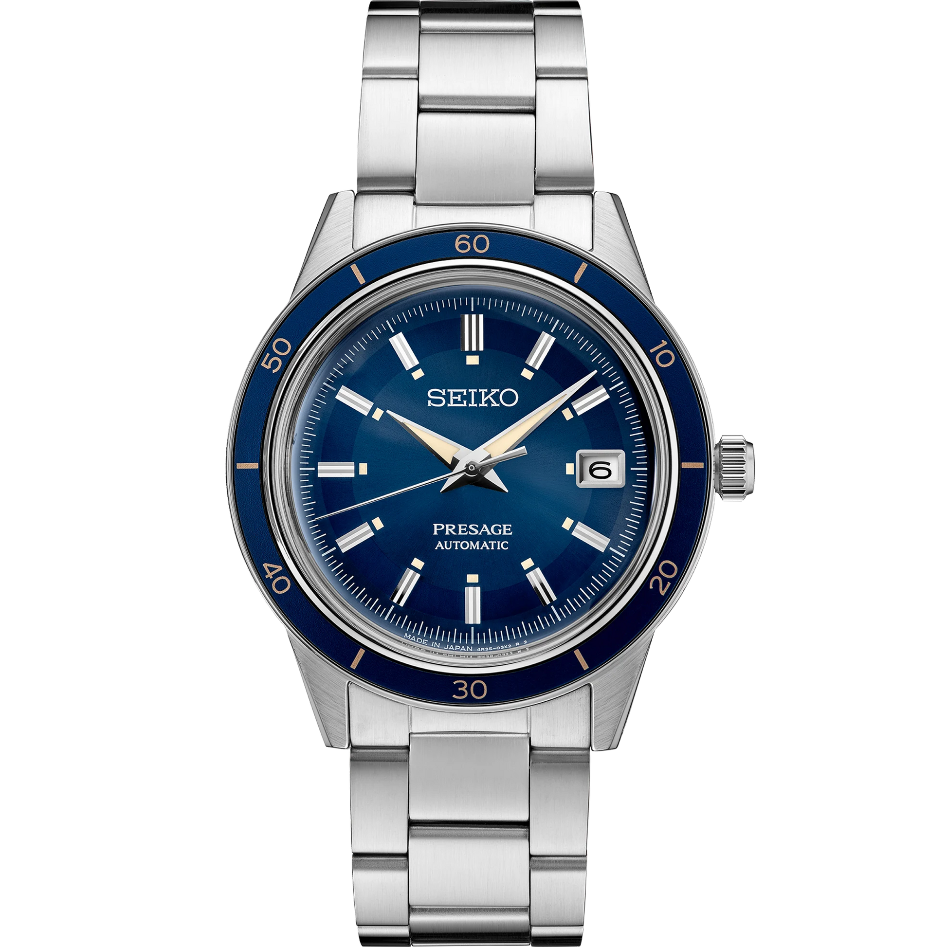 The SEIKO SRPG05 from the Presage Style60's Collection showcases exceptional Japanese mechanical craftsmanship, blending precision with retro design inspired by the 1964 "Crown Chronograph." With a striking blue dial framed by a blue bezel with rose gold accents, this model offers a refined yet timeless appeal. The automatic 23-jewel movement ensures both reliability and precision.