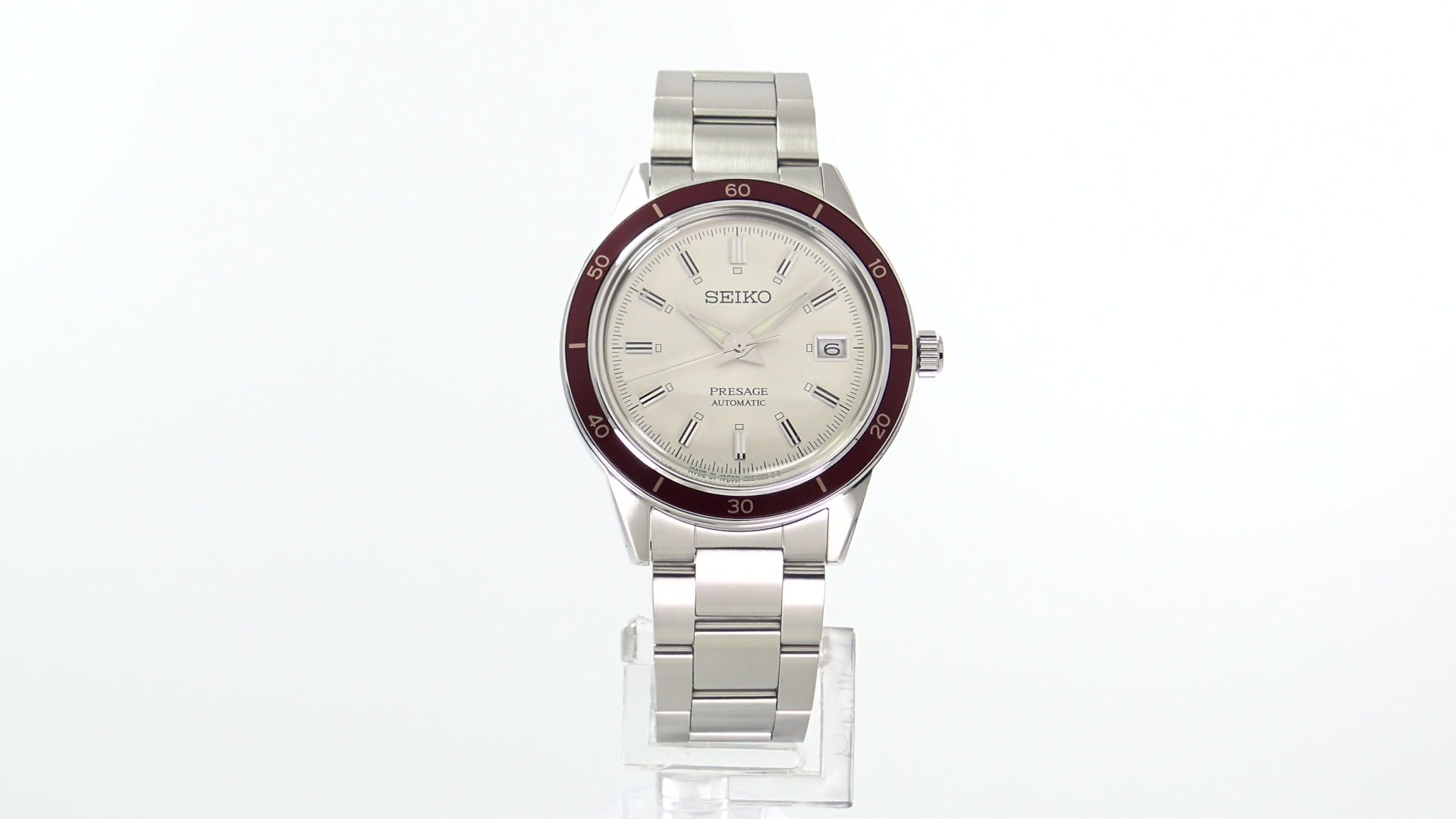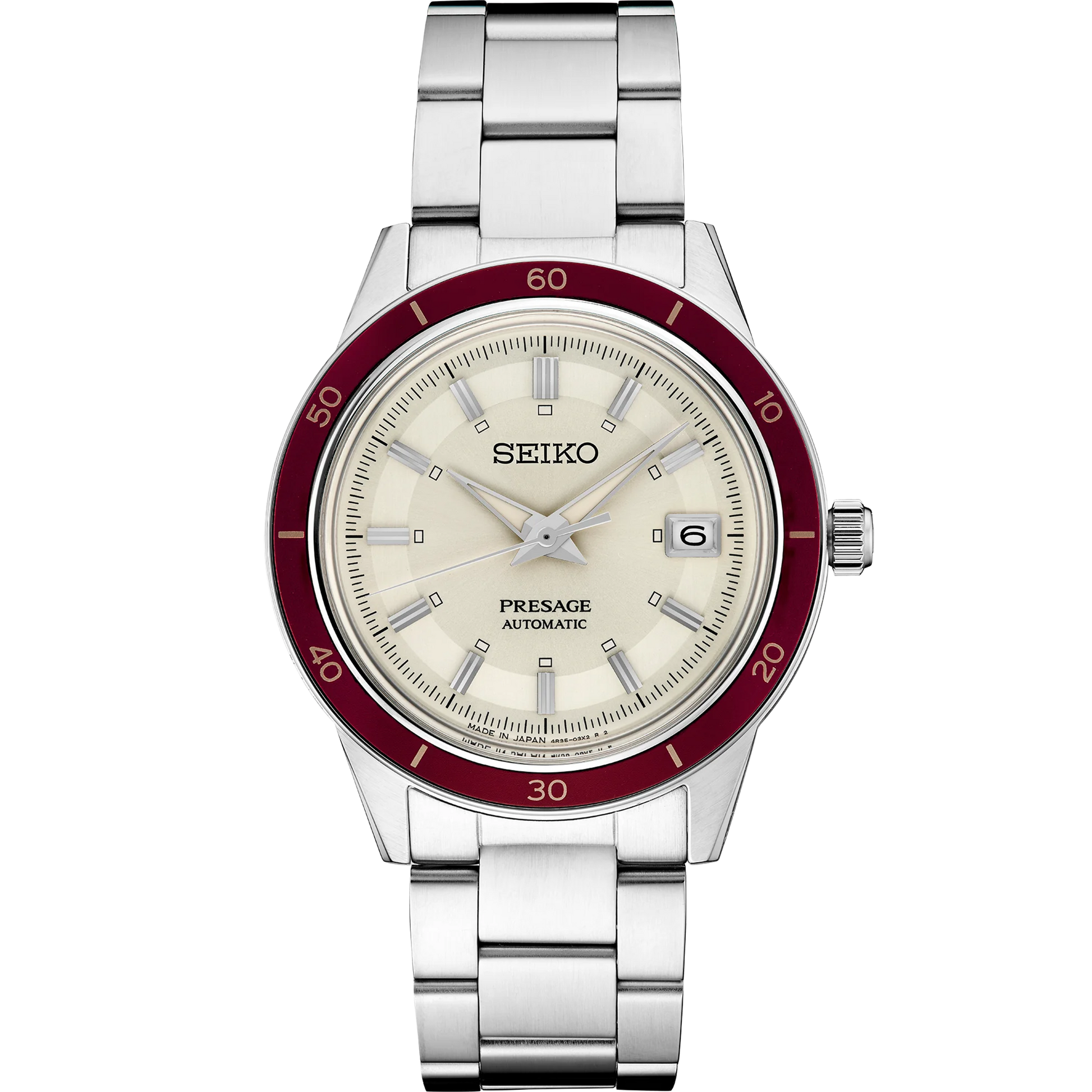 he SEIKO SRPH93 from the Presage Style60's Collection is a fine example of Japanese mechanical watchmaking, blending precision with a retro 1960s-inspired design. The ivory sunray dial and matte red bezel give this timepiece a distinctive and timeless appeal, while the 23-jewel automatic movement ensures reliable performance.